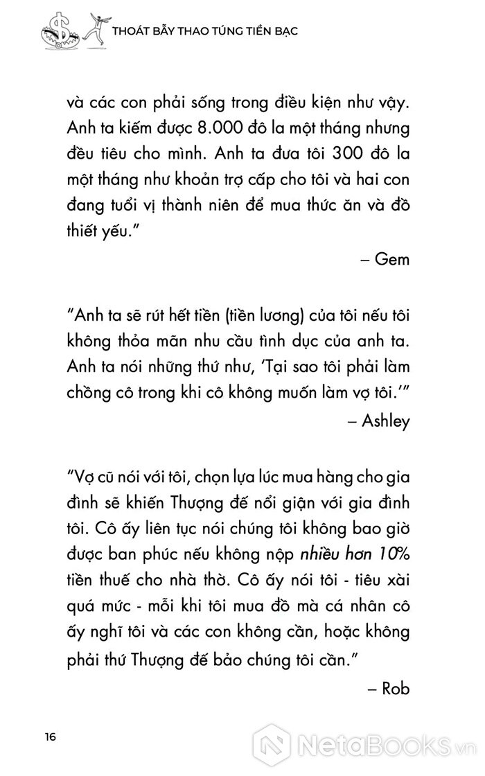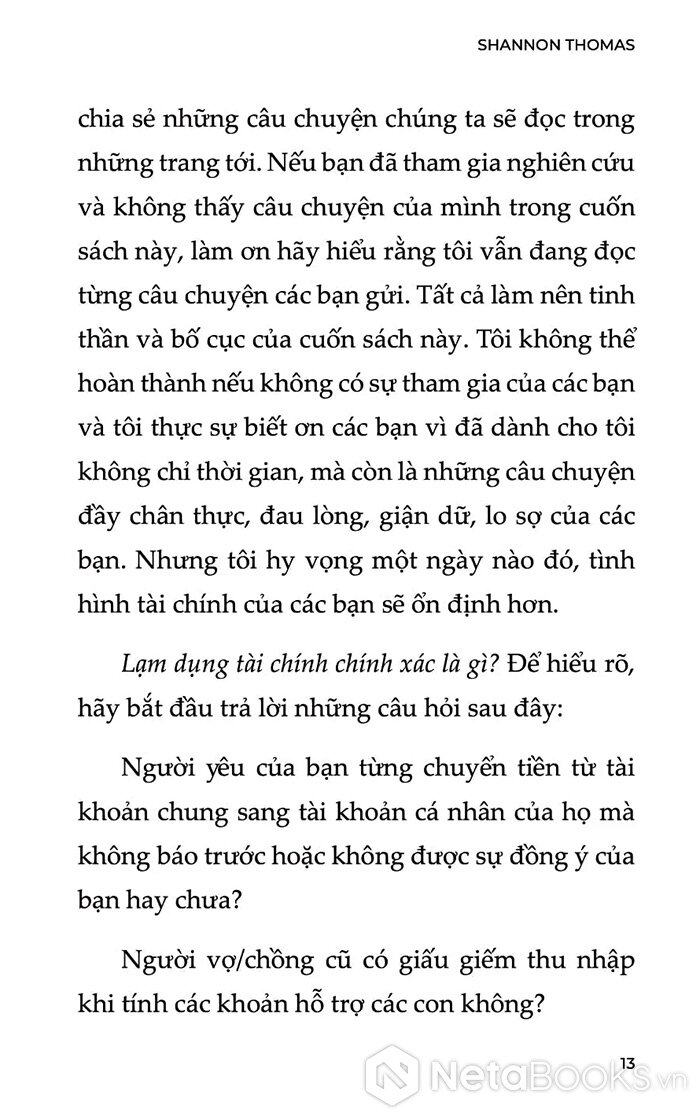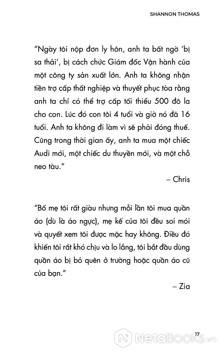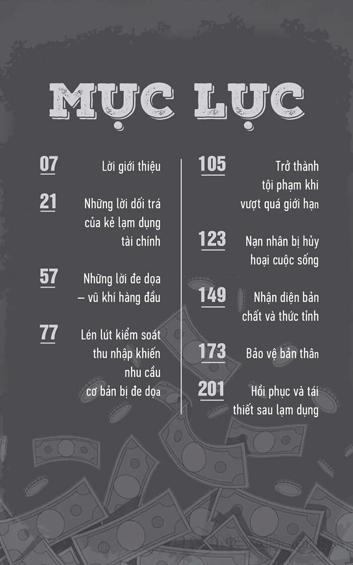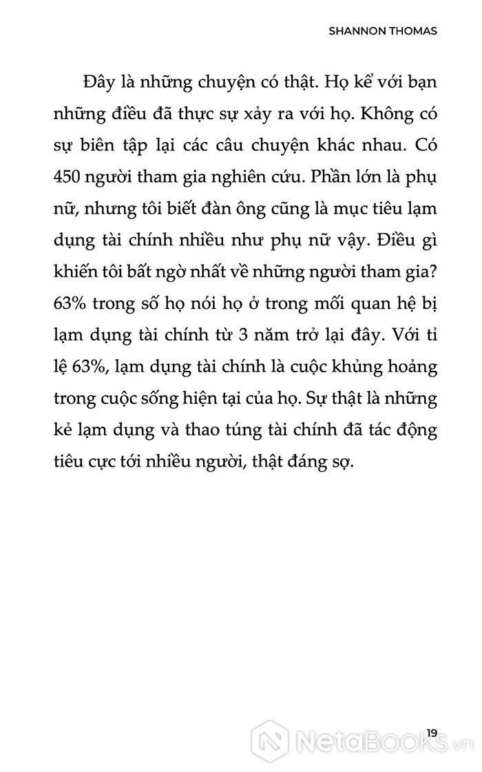 Dựa trên một nghiên cứu định tính với hơn 450 người tham gia, cuốn sách tập hợp những câu chuyện thật, đau xót và chân thực đến rợn người. Đó là tiếng nói bị bóp nghẹt suốt nhiều năm, giờ đây được cất lên một cách dũng cảm. Tác giả - một chuyên gia trị liệu tâm lý - không chỉ phân tích rõ các hành vi thao túng tài chính, mà còn đưa ra lộ trình hồi phục cảm xúc và tái thiết cuộc sống sau khi thoát khỏi vòng kiểm soát độc hại.