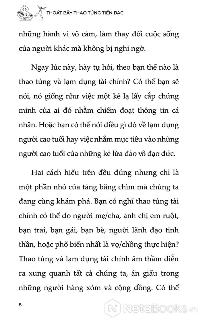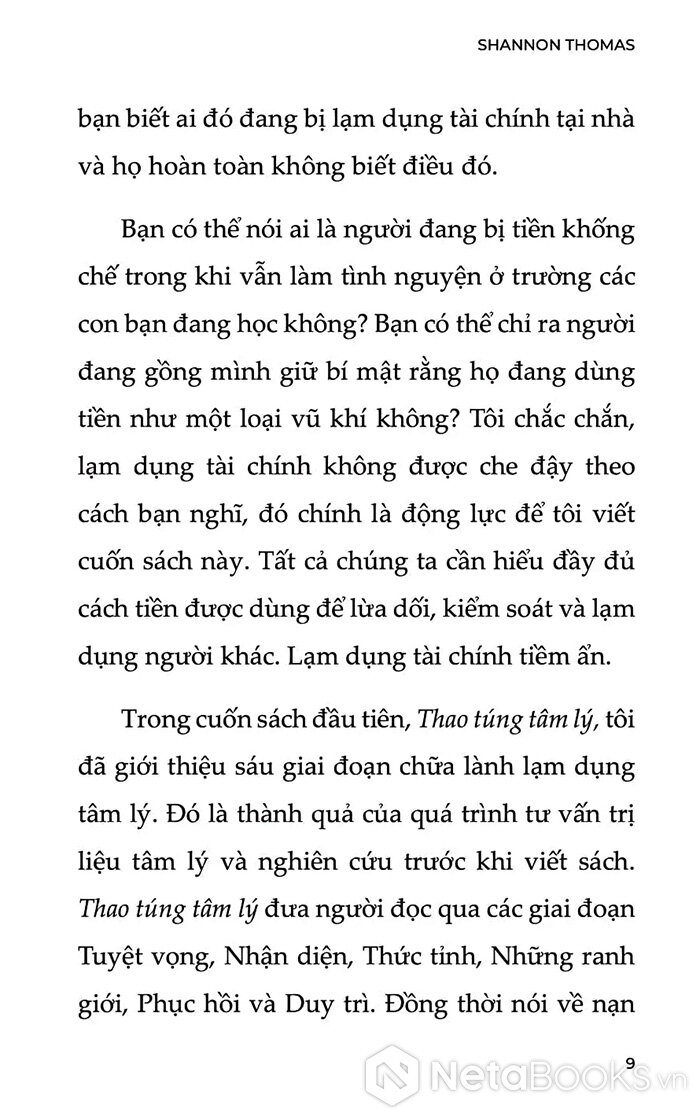 Thoát Bẫy Thao Túng Tiền Bạc là cuốn sách đầu tiên chuyên sâu về chủ đề lạm dụng tài chính - một dạng thao túng tinh vi nhưng thường bị xem nhẹ trong các mối quan hệ gia đình, tình cảm, tôn giáo và công việc. Đây không chỉ là câu chuyện về tiền, mà là câu chuyện về quyền lực, sự kiểm soát và tổn thương tâm lý kéo dài âm thầm qua năm tháng.