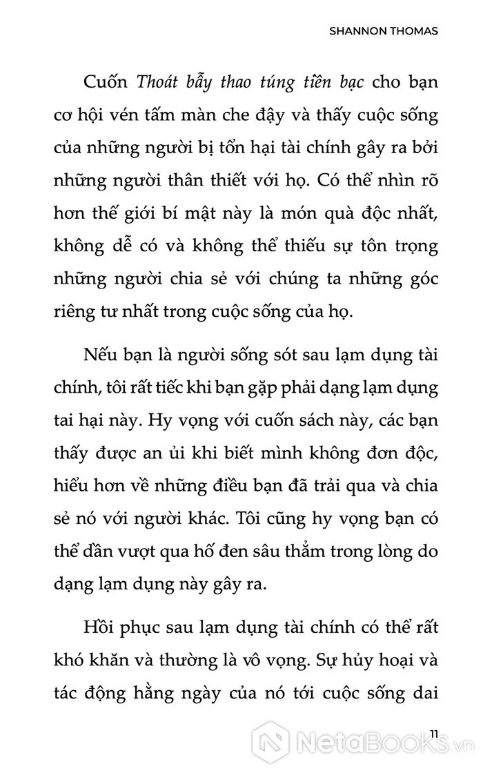 Thoát Bẫy Thao Túng Tiền Bạc không chỉ dành cho người từng trải qua lạm dụng, mà còn dành cho những ai đang làm công tác xã hội, trị liệu tâm lý, hay đơn giản là muốn hiểu rõ hơn cách tiền bạc bị biến thành công cụ thao túng. Một cuốn sách cần thiết trong bối cảnh các mối quan hệ ngày càng phức tạp, nơi tổn thương không còn đến từ bạo lực thể chất, mà từ sự kiểm soát vô hình mang tên “tiền bạc”.