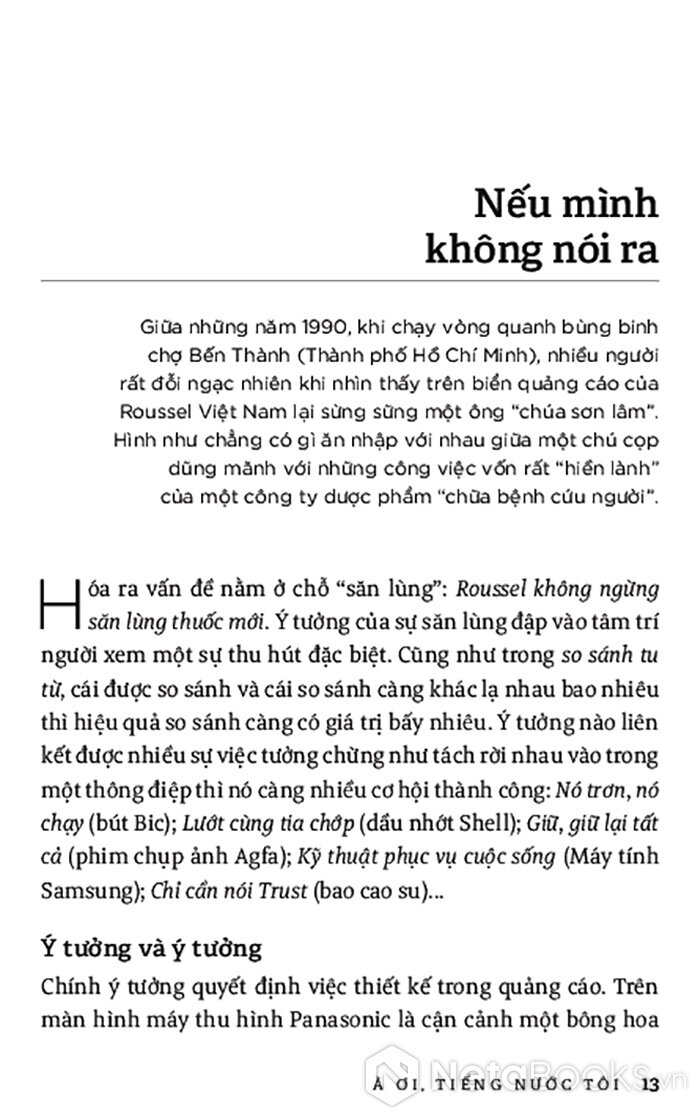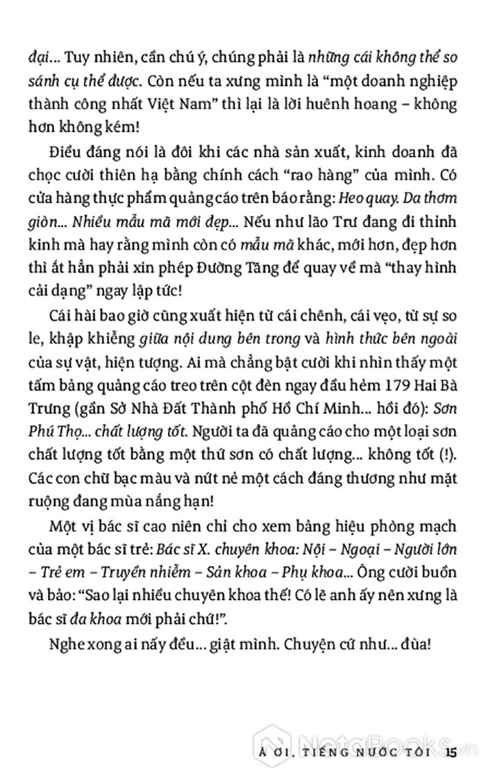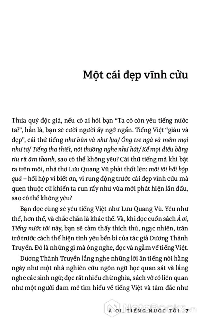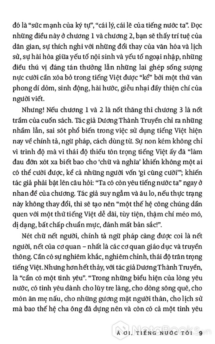 “À ơi, Tiếng nước tôi”, tựa như lời mẹ ru dịu hiền lắng đọng tự sâu trong tim mọi người con nước Việt, được cất lên bằng những âm điệu đẹp đẽ của một thứ tiếng “Óng tre ngà và mềm mại như tơ/ Tiếng tha thiết, nói thường nghe như hát” (thơ Lưu Quang Vũ). Chính trong tình thương yêu trìu mến ấy, tác giả đã dành mọi xúc cảm và tâm huyết, thậm chí có xót xa, trăn trở, để lắng nghe, ghi chép liên tục trên hành trình theo dấu tiếng nước ta. Bước chân hành trình khởi đầu từ những câu chuyện của tiền nhân, sự uyển chuyển, sâu sắc trong lời thơ ý nhạc, cái hóm hỉnh, khéo léo trong lời ăn tiếng nói, nét mềm mại, du dương của âm điệu cất lên… cho đến tiếng Việt thời nay rộn ràng, trẻ trung và đầy sống động với nhiều lớp từ mới sản sinh ra mỗi ngày. Và trên tất cả, chính là tình yêu tiếng Việt sâu sắc của tác giả cùng sự tự vấn làm sao có thể đánh thức tình yêu ấy bên trong mỗi con người, để tất cả chung sức đồng lòng duy trì vẻ đẹp vĩnh cửu của tiếng nước ta.