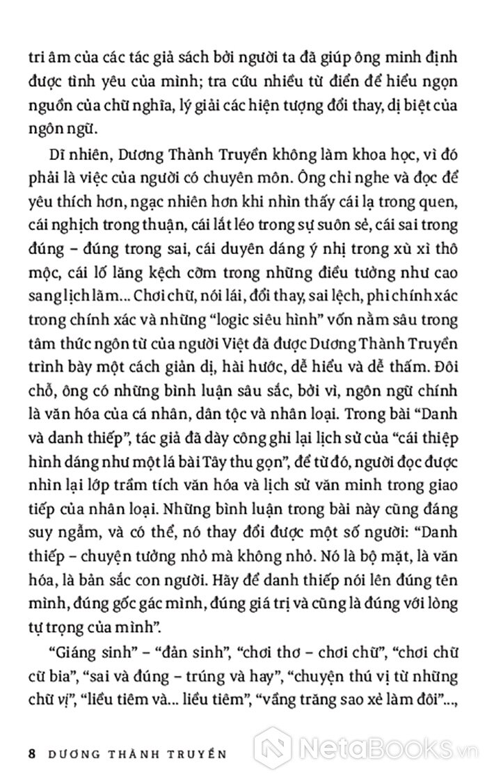“Dương Thành Truyền lắng nghe những lời ăn tiếng nói hằng ngày; đọc rất nhiều chữ nghĩa, sách vở có liên quan như một người đam mê tìm hiểu về tiếng Việt và tâm đắc như tri âm của các tác giả sách bởi người ta đã giúp ông minh định được tình yêu của mình… Ông chỉ nghe và đọc để yêu thích hơn, ngạc nhiên hơn khi nhìn thấy cái lạ trong quen, cái nghịch trong thuận, cái lắt léo trong sự suôn sẻ, cái sai trong đúng - đúng trong sai, cái duyên dáng ý nhị trong xù xì thô mộc, cái lố lăng kệch cỡm trong những điều tưởng như cao sang lịch lãm… Chơi chữ, nói lái, đổi thay, sai lệch, phi chính xác trong chính xác và những ‘logic siêu hình’ vốn nằm sâu trong tâm thức ngôn từ của người Việt đã được Dương Thành Truyền trình bày một cách giản dị, hài hước, dễ hiểu và dễ thấm. Đôi chỗ, ông có những bình luận sâu sắc, bởi vì, ngôn ngữ chính là văn hóa của cá nhân, dân tộc và nhân loại.” - TS Nguyễn Thị Tịnh Thy