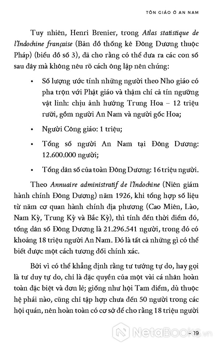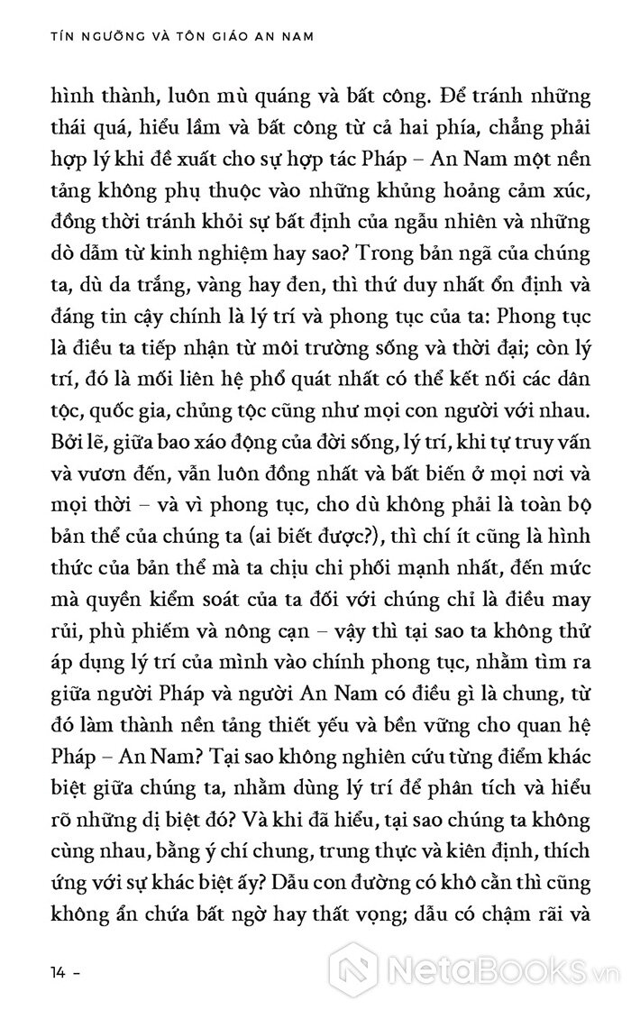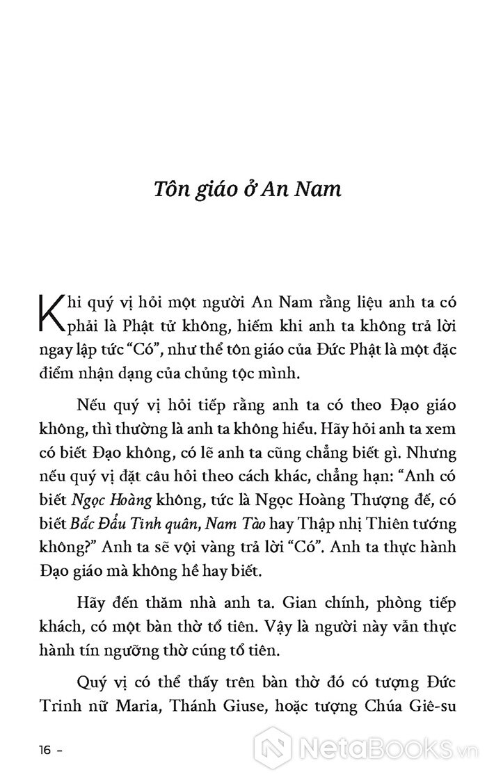 “Trong 20 thế kỷ, họ tiếp nhận bốn học thuyết triết học - tôn giáo: Đức Phật, Lão Tử, Khổng Tử và Chúa Ki-tô. Nếu Ki-tô giáo hoạt động bằng cách chiêu mộ cá nhân và lan tỏa dần dần, thì Phật giáo, Đạo giáo và Khổng giáo lại lan rộng thành từng lớp sóng lớn. Chúng không chồng chất lên nhau. Chúng cũng không hòa trộn để hình thành một tổng hợp mới và đặc thù. Khổng Tử đem đến cho tâm hồn An Nam nền tảng triết học, và học thuyết của ông được tiếp nhận hoàn toàn trong những khía cạnh mà người An Nam biết đến; bản thân Khổng giáo không có siêu hình học, nên nó không loại trừ bất cứ hệ thống tôn giáo giáo điều nào. Vì vậy, bất kỳ tôn giáo nào cũng có thể bổ sung cho nó, và chính cái bổ sung siêu hình ấy, nếu muốn gọi như vậy, là điều mà Phật giáo và Đạo giáo đã cống hiến cho tâm hồn An Nam.”