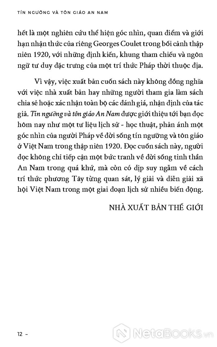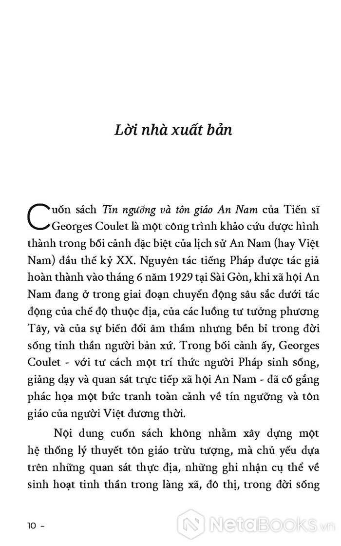 “Tín ngưỡng và tôn giáo An Nam” của Tiến sĩ Georges Coulet là một công trình khảo cứu được hình thành trong bối cảnh đặc biệt của lịch sử An Nam (Việt Nam) đầu thế kỷ XX. Nguyên tác tiếng Pháp được hoàn thành vào tháng 6 năm 1929 tại Sài Gòn, khi xã hội An Nam đang trải qua những chuyển động sâu sắc dưới tác động của chế độ thuộc địa, của các luồng tư tưởng phương Tây, cũng như những biến đổi âm thầm nhưng bền bỉ trong đời sống tinh thần của người bản xứ. Trong hoàn cảnh ấy, Georges Coulet - một trí thức người Pháp sinh sống, giảng dạy và quan sát trực tiếp xã hội An Nam - đã nỗ lực phác họa một bức tranh toàn cảnh về tín ngưỡng và tôn giáo của người Việt đương thời.