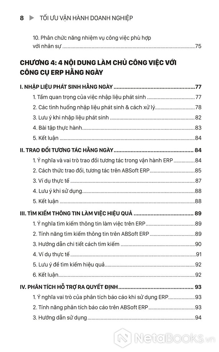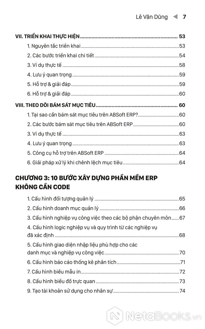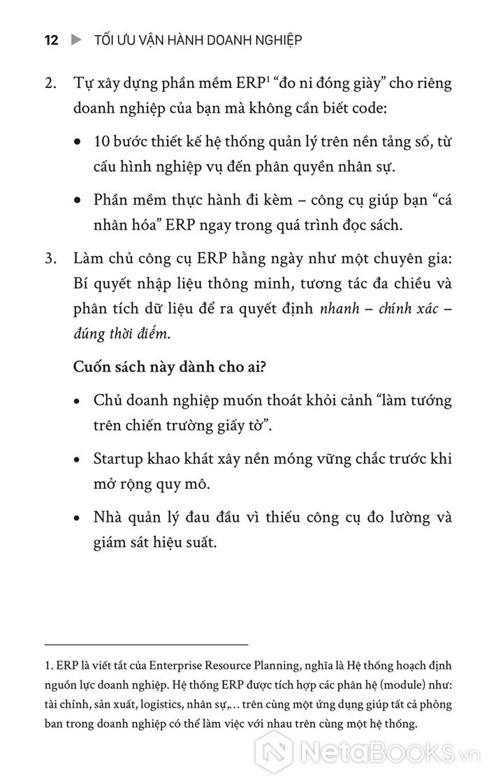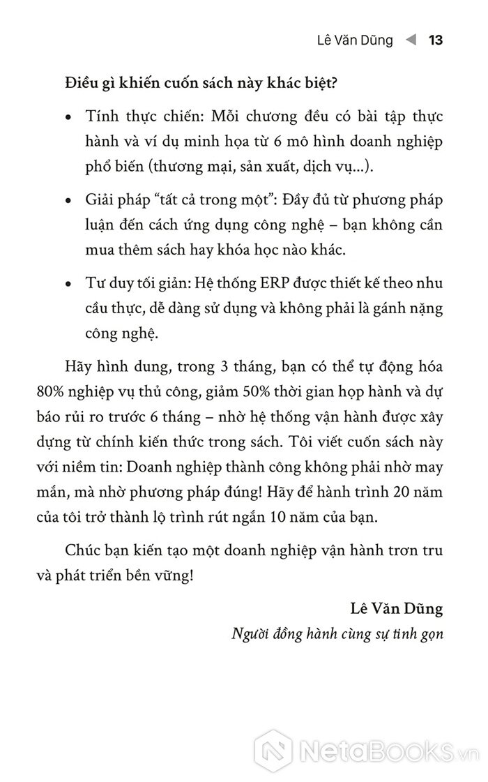 Tác giả Lê Văn Dũng chia sẻ kinh nghiệm thực chiến suốt 20 năm qua, cô đọng thành 8 bước tối ưu vận hành và 10 bước thiết kế hệ thống ERP "đo ni đóng giày" cho từng doanh nghiệp. Sách trình bày rõ ràng các khái niệm cốt lõi như: đối tượng quản lý, danh mục và nghiệp vụ - từ đó giúp người đọc tự xây dựng quy trình quản lý không lỗ hổng, vận hành tinh gọn, tăng hiệu suất 30% chỉ sau 3 tháng áp dụng. Đi kèm là các ví dụ minh họa, mẫu biểu và phần mềm thực hành ERP trực tiếp.