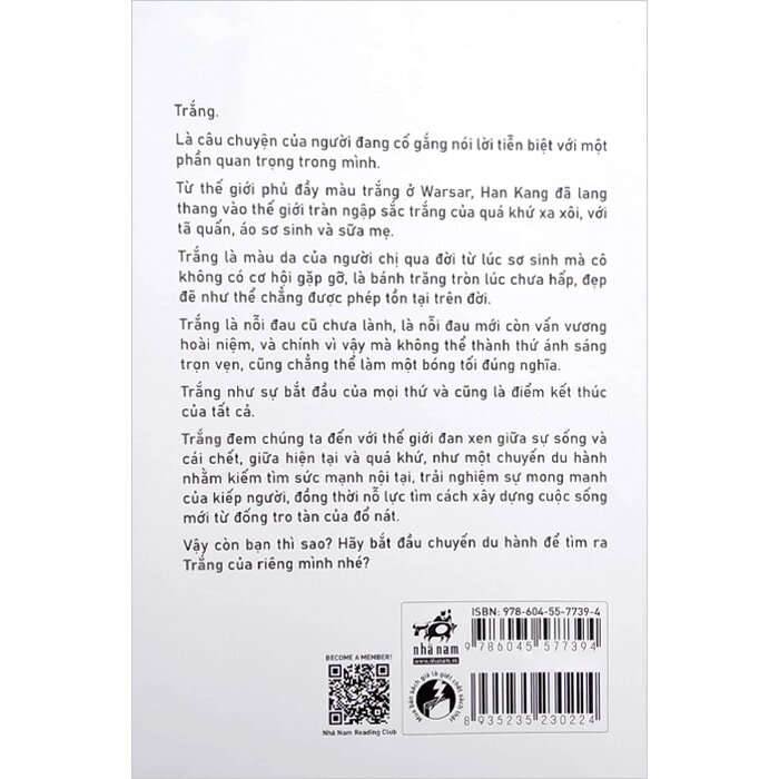 Là câu chuyện của người đang cố gắng nói lời tiễn biệt với một phần quan trọng trong mình. Từ thế giới phủ đầy màu trắng ở Warsar, Han Kang đã lang thang vào thế giới tràn ngập sắc trắng của quá khứ xa xôi, với tã quấn, áo sơ sinh và sữa mẹ.