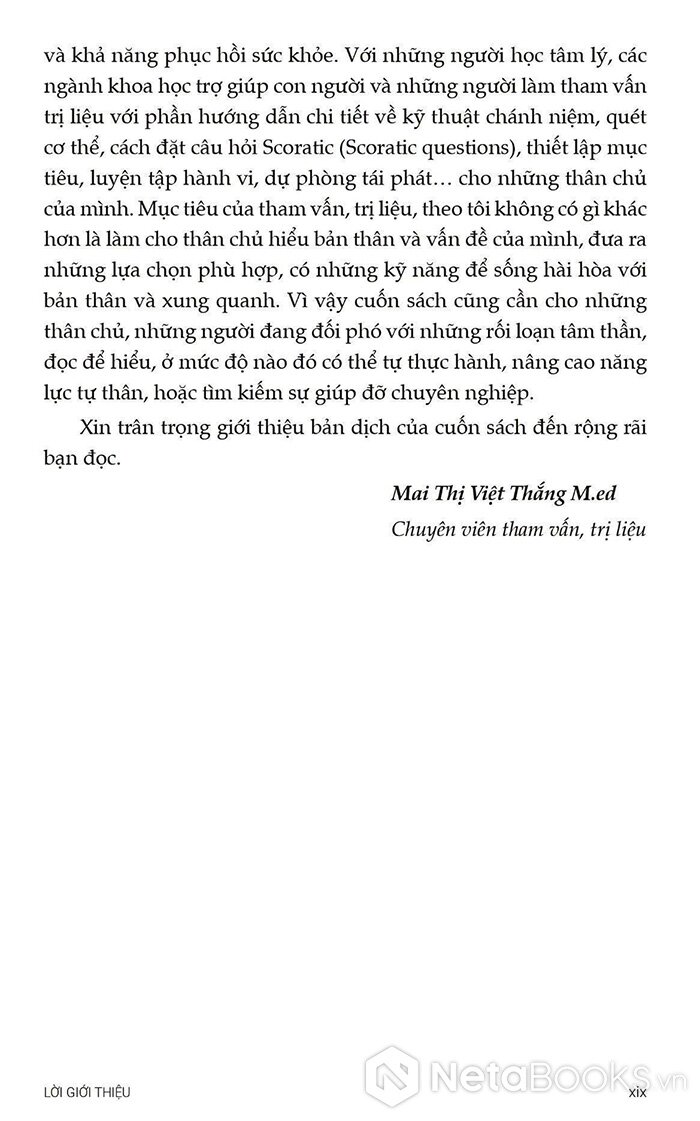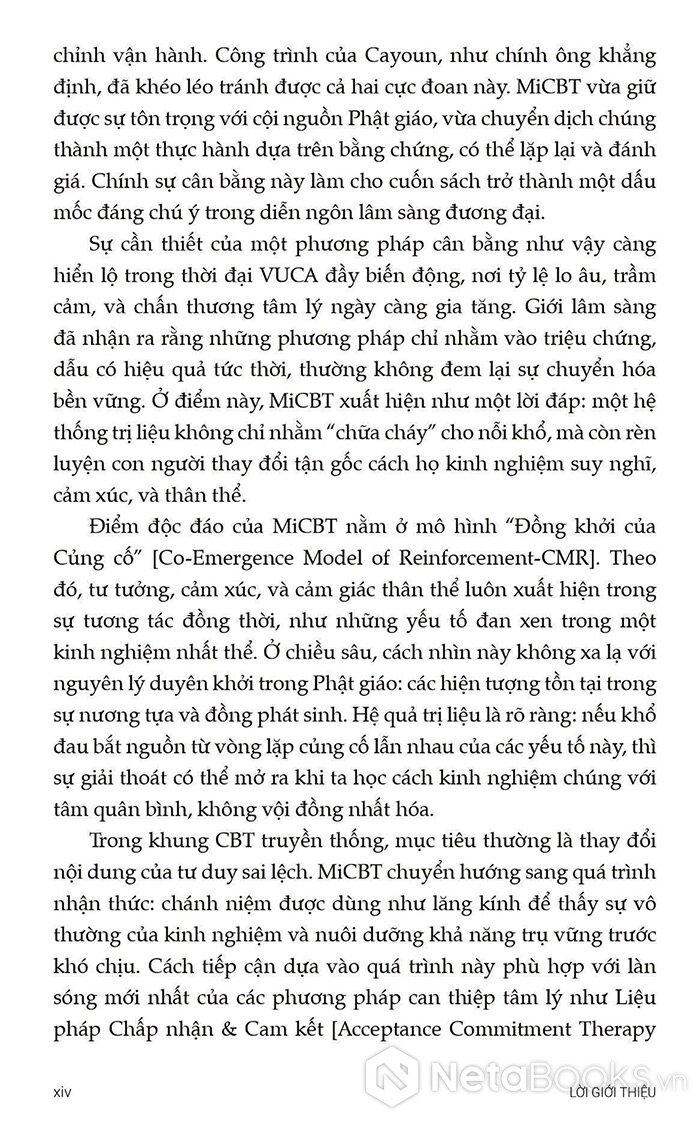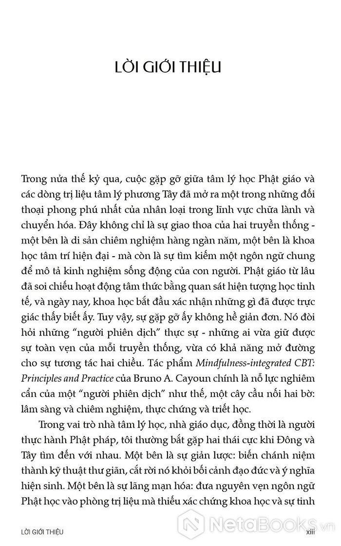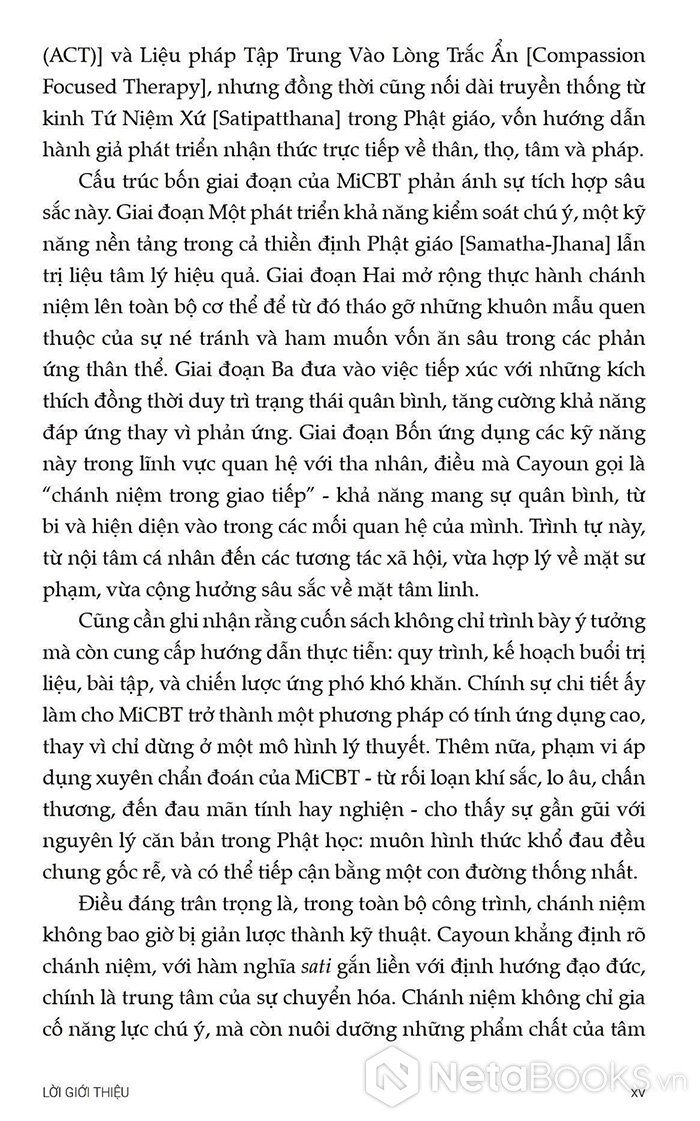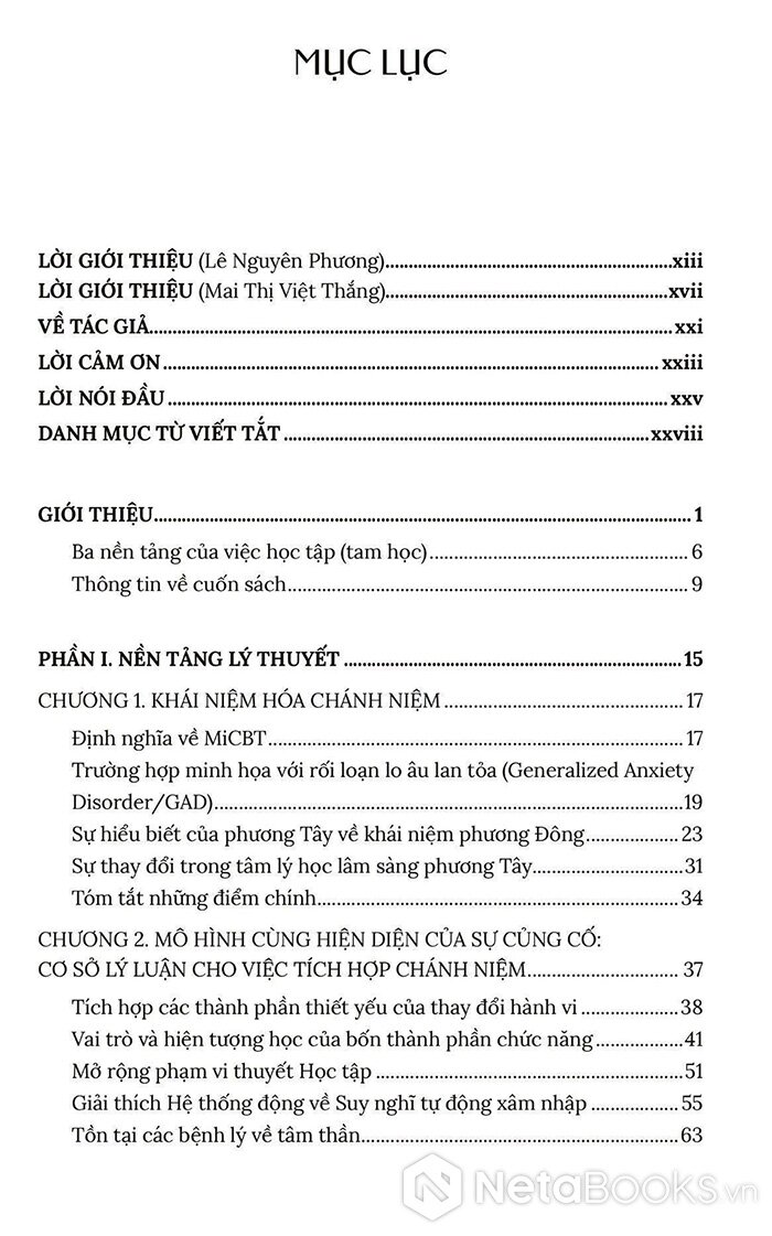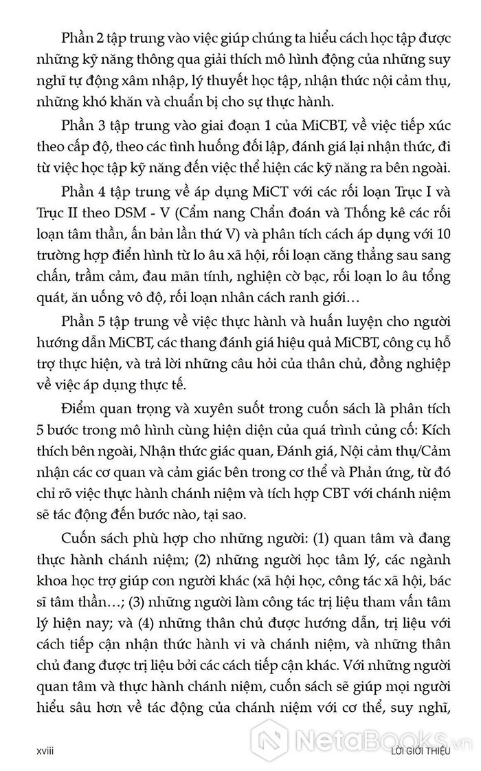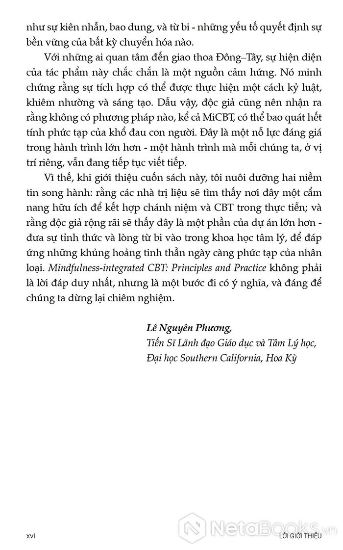 Từ nền tảng đó, cuốn sách Trị liệu Nhận thức Hành vi Tích hợp Chánh niệm - Nguyên tắc và Thực hành ra đời như một hướng dẫn toàn diện cho các nhà trị liệu, giảng viên và cả những người thực hành quan tâm đến MiCBT. Sách không chỉ trình bày lý thuyết một cách rõ ràng mà còn cung cấp hướng dẫn cụ thể từng bước để ứng dụng trong thực tế lâm sàng.