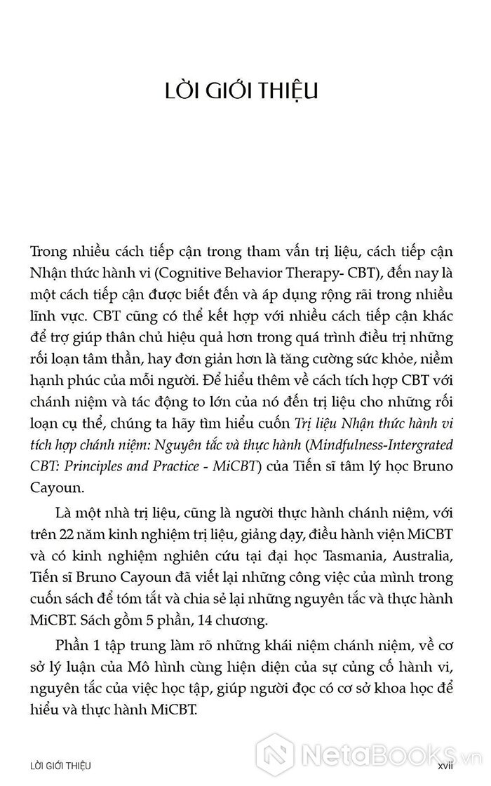 Sách Trị Liệu Nhận Thức Hành Vi Tích Hợp Chánh Niệm - Nguyên Tắc Và Thực Hành của tác giả Bruno A. Cayoun, có bán tại Nhà sách online NetaBooks với ưu đãi Bao sách miễn phí và Gian hàng NetaBooks tại Tiki với ưu đãi Bao sách miễn phí và tặng Bookmark