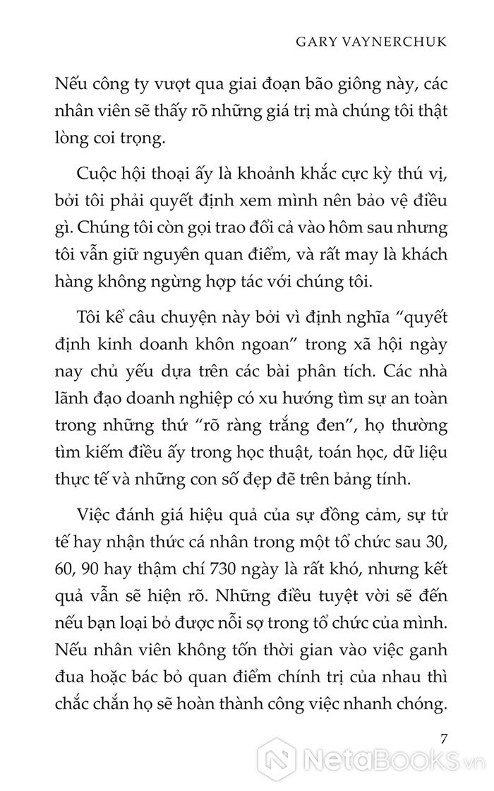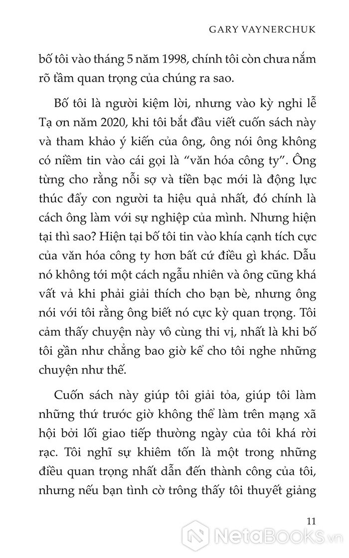 Gary Vaynerchuk là doanh nhân, nhà đầu tư, diễn giả và tác giả bán chạy của New York Times. Ông là CEO của VaynerMedia - một trong những công ty truyền thông kỹ thuật số hàng đầu thế giới và là nhà sáng lập VaynerX, hệ sinh thái truyền thông hiện đại.