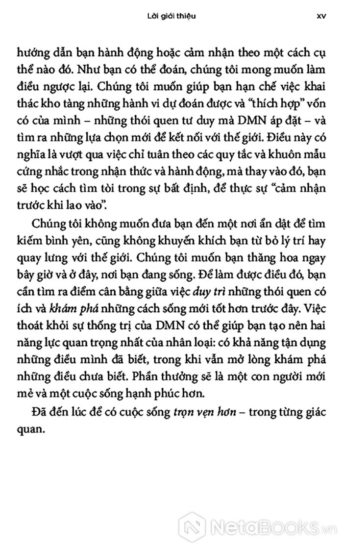 Trong cuốn sách “Trọn vẹn từng giác quan”, nhà thần kinh học Norman Farb và nhà tâm lý lâm sàng Zindel Segal giải thích rằng bộ não có hai mạng lưới: mạng lưới giải quyết vấn đề nhanh chóng (thói quen) và mạng lưới cảm giác, dành riêng cho những hiểu biết mới mẻ. Bằng cách điều chỉnh vào những cảm giác mới và hàng ngày - từ cảm giác bàn chân trên đường phố đông đúc đến tiếng chim hót trong công viên - chúng ta có thể kích hoạt mạng lưới cảm giác. Khi căng thẳng hoặc bị mắc kẹt, chúng ta có thể tạm dừng để chú ý và cảm nhận thế giới sôi nổi, sống động xung quanh mình và tăng cường khả năng phục hồi, sức khỏe, hạnh phúc và sự sáng tạo bất kể ở nơi nào, ngay thời điểm hiện tại.