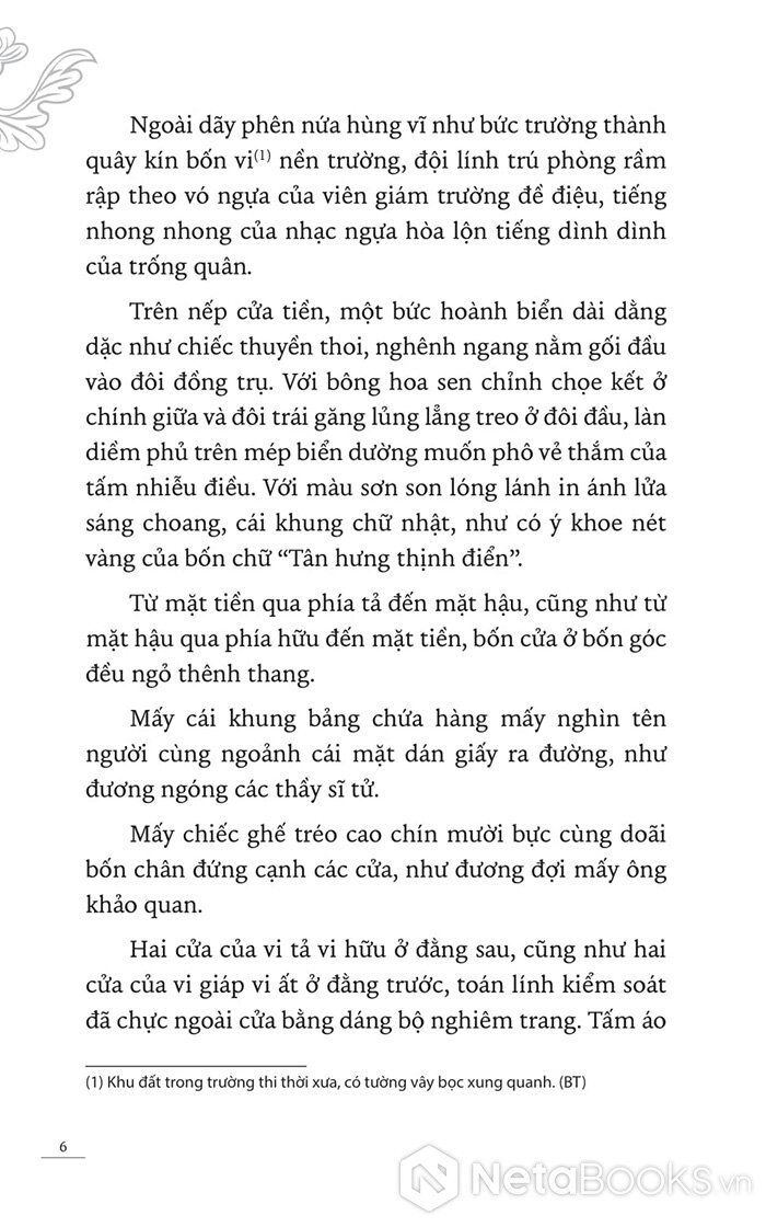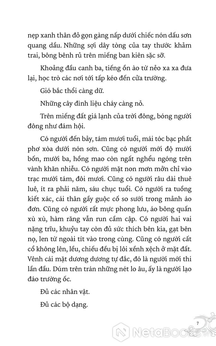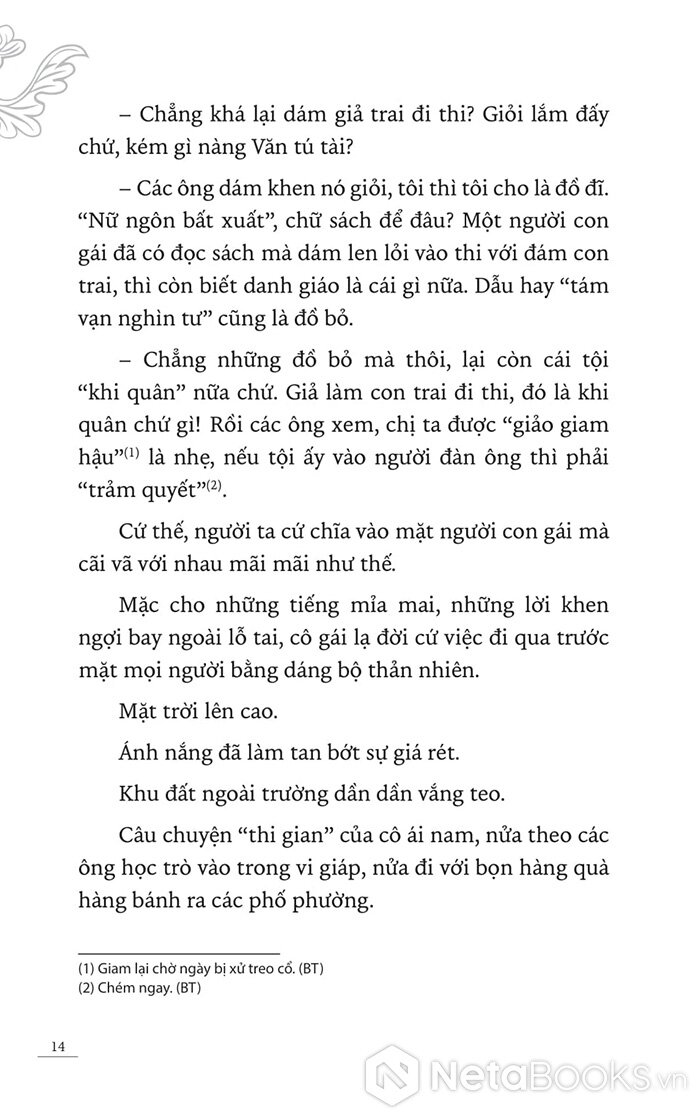 “Tần ngần, nàng chống tay vào khung cửa sổ, vơ vẩn nhìn trời, nhìn mây, nhìn những ngọn cỏ lơ thơ ở bờ hồ bên kia, để cân nhắc thêm một lần nữa, xem những ý nghĩ vừa rồi có đúng hay không đúng. Nàng thấy những thứ lễ nghi, chế độ của những ông thánh, ông hiền đặt ra cho đàn bà con gái, rặt là những cái xiềng xích.