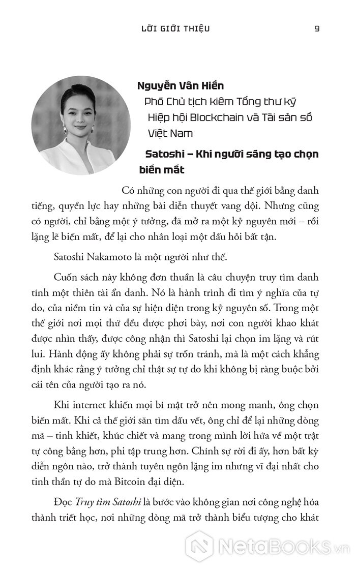 “Cuốn sách không chỉ truy tìm danh tính một thiên tài ẩn danh, mà còn là hành trình đi tìm ý nghĩa của tự do và niềm tin trong kỷ nguyên số.” - Chị Nguyễn Vân Hiền, Phó Chủ tịch kiêm Tổng thư ký Hiệp hội Blockchain & Tài sản số Việt Nam