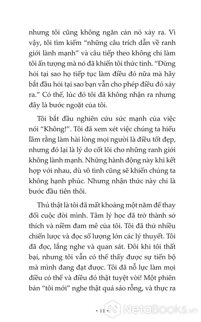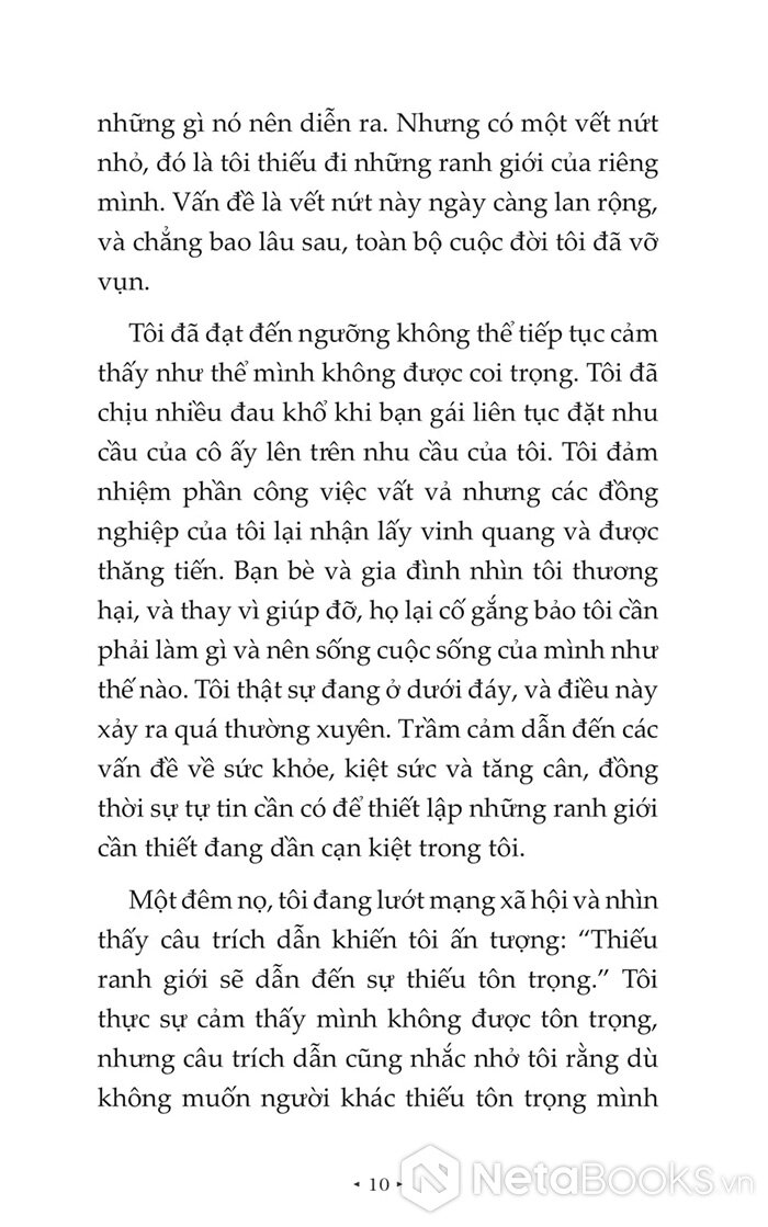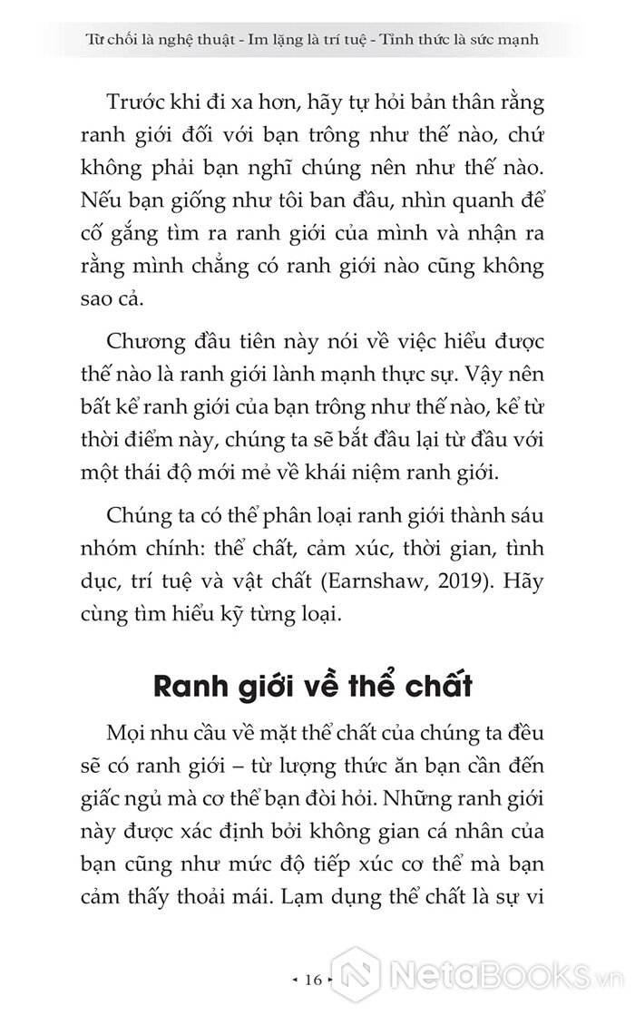 “Từ chối là nghệ thuật im lặng là trí tuệ tỉnh thức là sức mạnh” đi sâu vào 6 nhóm ranh giới quan trọng nhất thể chất, cảm xúc, thời gian, trí tuệ, tình dục và vật chất giúp người đọc: