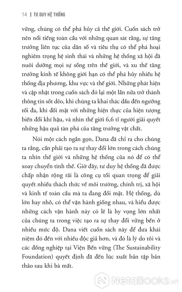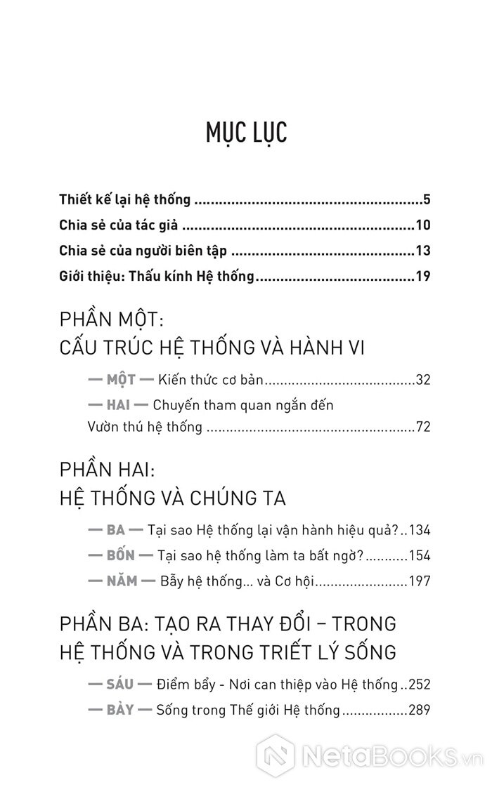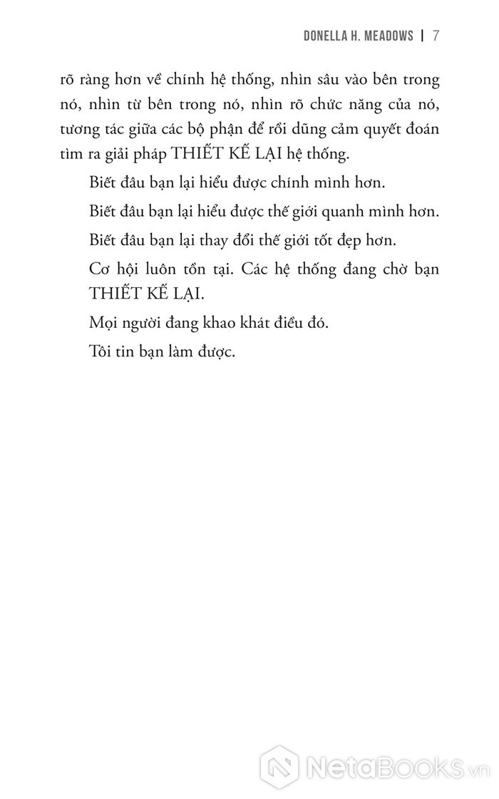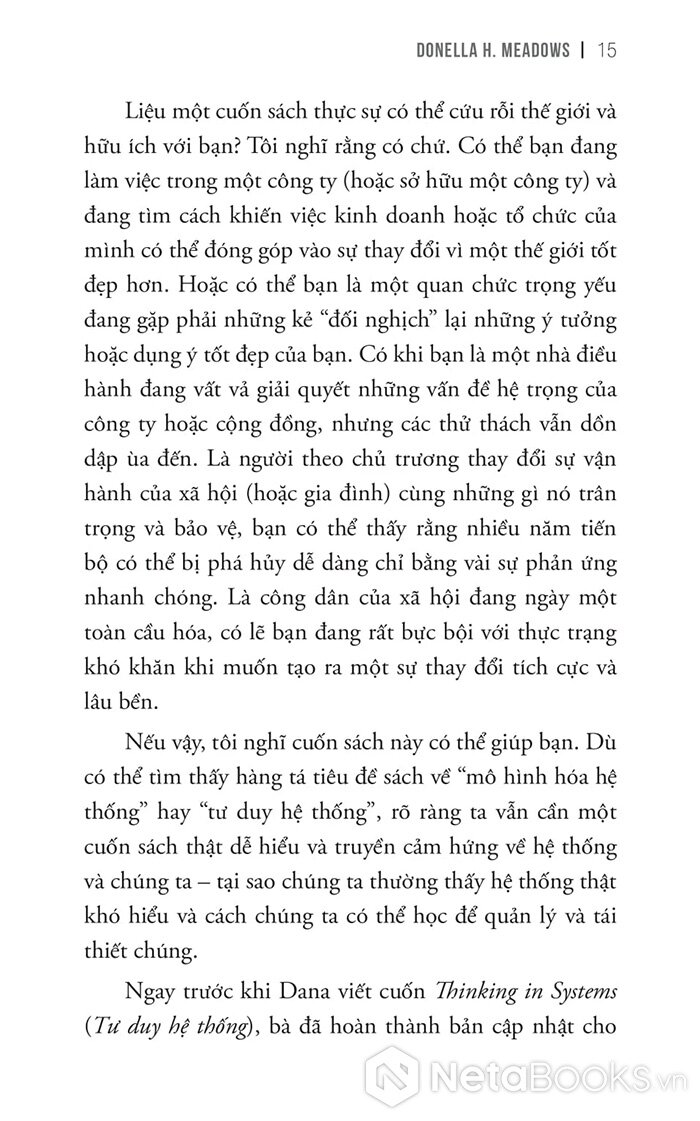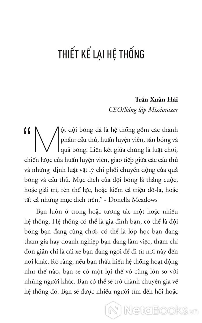 Nhưng tôi tin việc thấu hiểu cuốn sách vô cùng hiếm hoi về hệ thống này sẽ giúp ích nhiều cho bạn trong mọi mặt cuộc sống. Bạn sẽ bớt đổ lỗi cho những nguyên nhân (thực ra không hề tác động lớn) mà bắt đầu có cái nhìn tổng thể rõ ràng hơn về chính hệ thống, nhìn sâu vào bên trong nó, nhìn từ bên trong nó, nhìn rõ chức năng của nó, tương tác giữa các bộ phận để rồi dũng cảm quyết đoán tìm ra giải pháp THIẾT KẾ LẠI hệ thống.