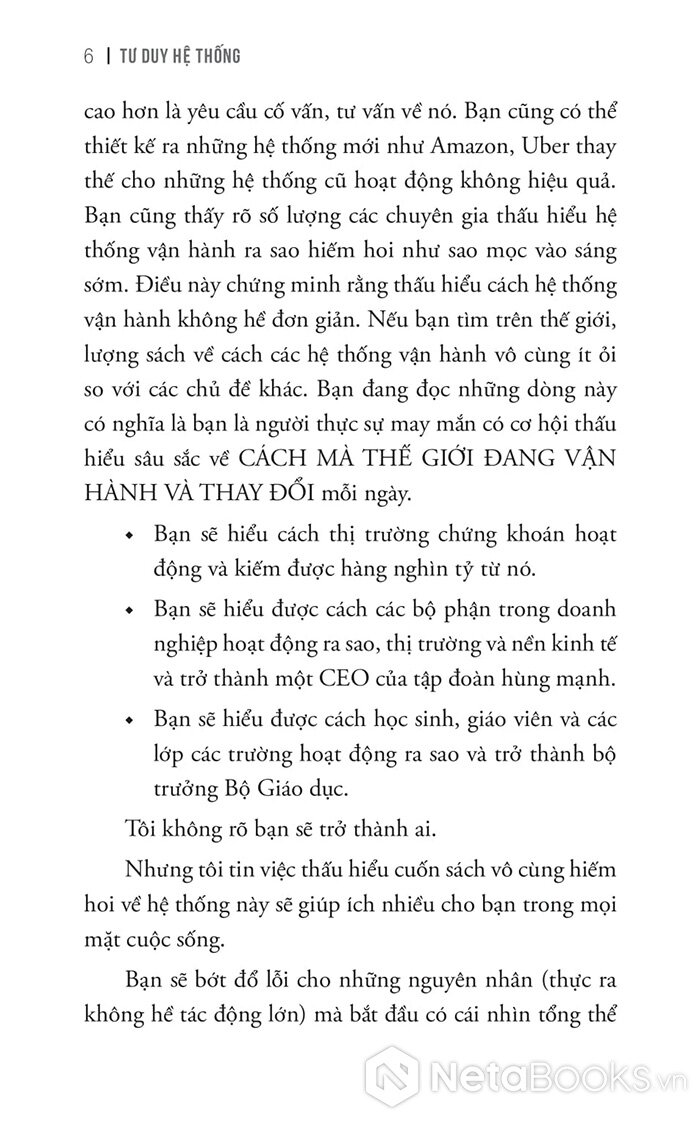 Bạn luôn ở trong hoặc tương tác một hoặc nhiều hệ thống. Hệ thống có thể là gia đình bạn, có thể là đội bóng bạn đang cùng chơi, có thể là lớp học bạn đang tham gia hay doanh nghiệp bạn đang làm việc, thậm chí đơn giản chỉ là cái xe bạn đang ngồi để đi từ nơi này đến nơi khác. Rõ ràng, nếu bạn thấu hiểu hệ thống hoạt động như thế nào, bạn sẽ có một lợi thế vô cùng lớn so với những người khác. Bạn có thể sẽ trở thành chuyên gia về hệ thống đó. Bạn sẽ được nhiều người tìm đến hỏi hoặc cao hơn là yêu cầu cố vấn, tư vấn về nó. Bạn cũng có thể thiết kế ra những hệ thống mới như Amazon, Uber thay thế cho những hệ thống cũ hoạt động không hiệu quả. Bạn cũng thấy rõ số lượng các chuyên gia thấu hiểu hệ thống vận hành ra sao hiếm hoi như sao mọc vào sáng sớm. Điều này chứng minh rằng thấu hiểu cách hệ thống vận hành không hề đơn giản. Nếu bạn tìm trên thế giới, lượng sách về cách các hệ thống vận hành vô cùng ít ỏi so với các chủ đề khác.