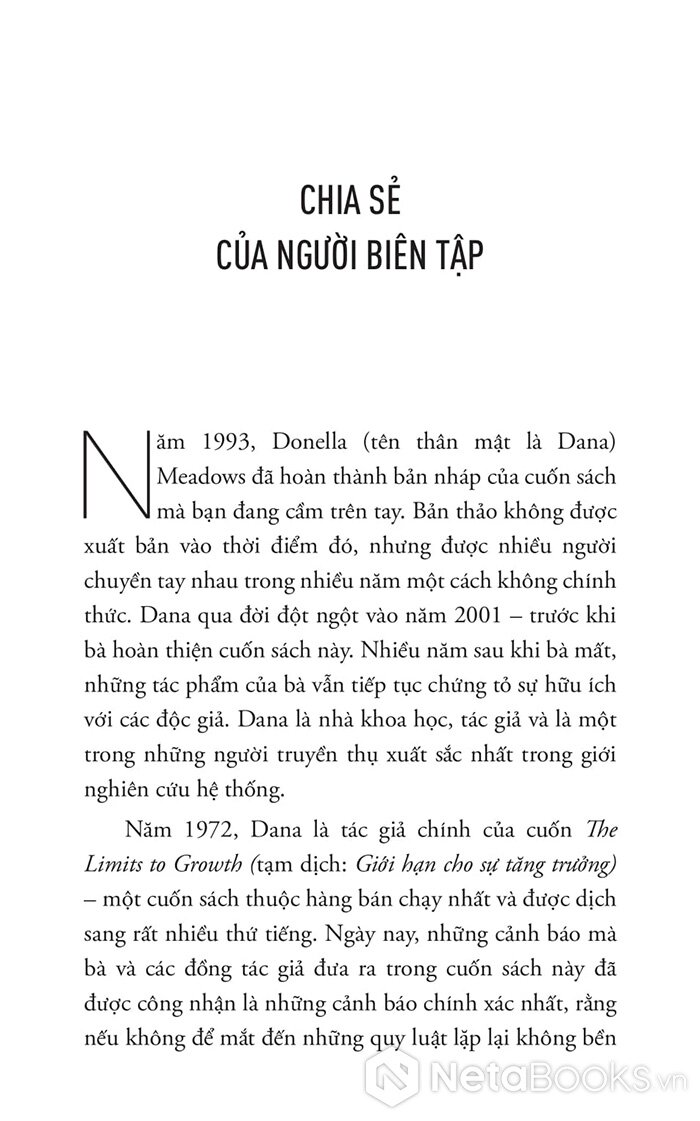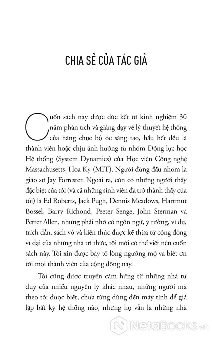 Donella Meadows là nhà khoa học hệ thống hàng đầu thế giới, đã viết nên cuốn sách này bằng sự sáng suốt, giản dị và sâu sắc. Dù bạn là nhà quản lý, kỹ sư, giáo viên hay người đang tìm kiếm lời giải cho những vấn đề phức tạp. Cuốn sách sẽ là kim chỉ nam đầy cảm hứng.