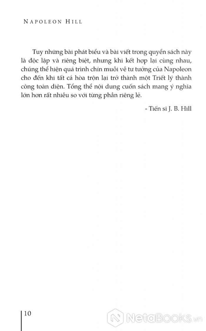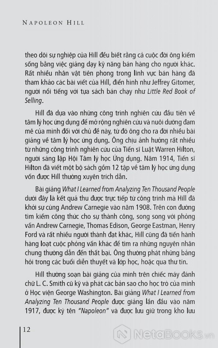 Sẽ không quá lời khi nói rằng, Napoleon Hill (1883 - 1970) là tác giả có ảnh hưởng rộng rãi nhất, mạnh mẽ nhất trong lĩnh vực thành công cá nhân hơn bất cứ một nhân vật nào trong lịch sử. Với công trình kéo dài gần 30 năm mang tên Nghĩ giàu và làm giàu (Think and Grow Rich), ông được mệnh danh là “người tạo ra các nhà triệu phú của thế giới” bởi đã truyền nguồn cảm hứng và một triết lý thành công dựa trên phương pháp tư duy tích cực, hiệu quả và những phẩm chất tốt đẹp trong tính cách cho hàng triệu người trên thế giới. Bộ tác phẩm nghĩ giàu làm giàu của ông được xem là một trong những tác phẩm bán chạy nhất mọi thời đại.