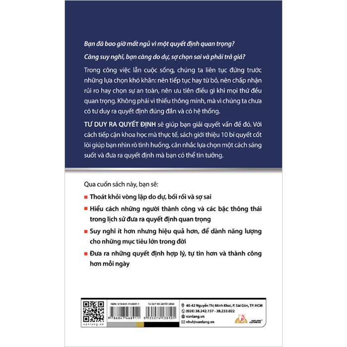Tư Duy Ra Quyết Định sẽ giúp bạn giải quyết vấn đề đó. Với cách tiếp cận khoa học mà thực tế, sách giới thiệu 10 bí quyết cốt lõi giúp bạn nhìn rõ tình huống, cân nhắc lựa chọn một cách sáng suốt và đưa ra quyết định mà bạn có thể tin tưởng.