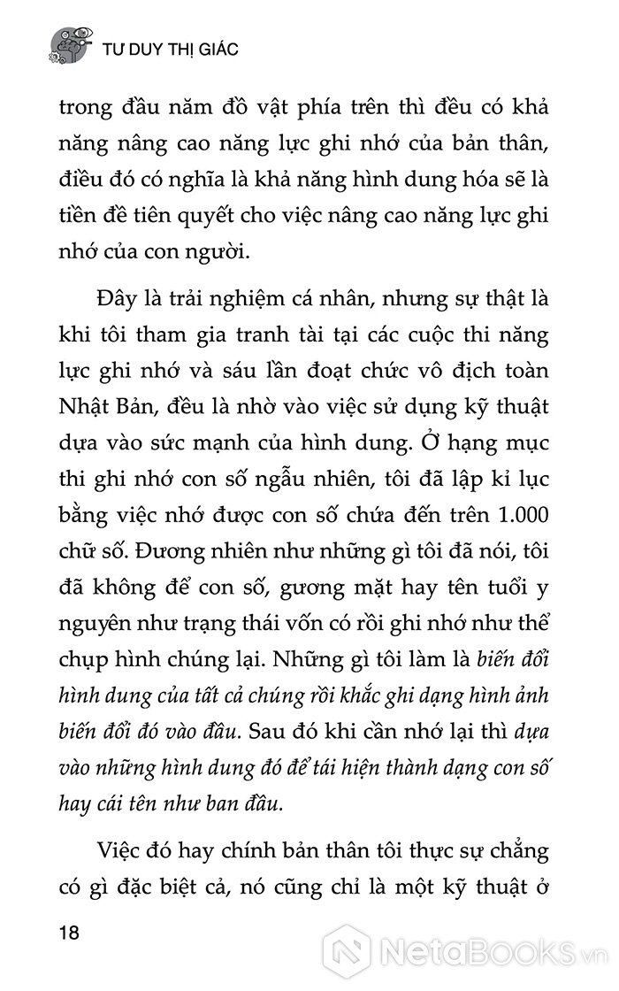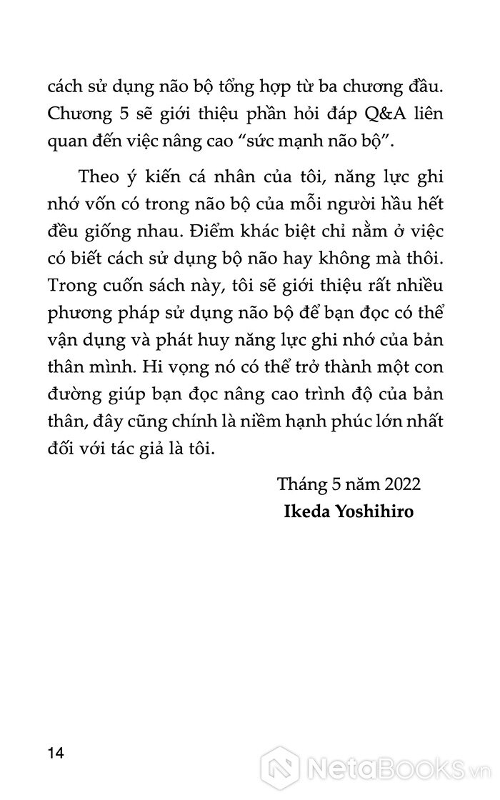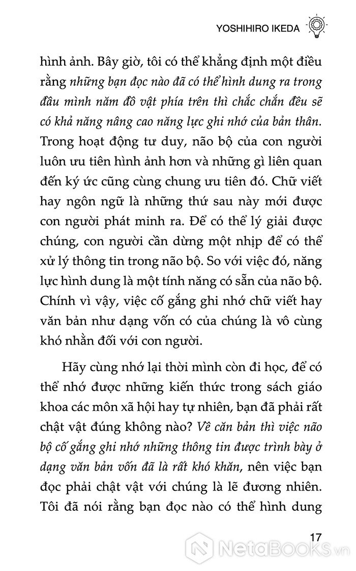 Cuốn sách được viết bởi Yoshihiro Ikeda - Kiện tướng Trí nhớ đầu tiên của Nhật Bản, đồng thời là người giữ kỷ lục 6 lần vô địch cuộc thi Siêu trí nhớ Nhật Bản. Với kinh nghiệm luyện tập và thi đấu trong lĩnh vực ghi nhớ chuyên sâu, tác giả đã hệ thống hóa một phương pháp tư duy dựa trên hình ảnh, có thể áp dụng cho mọi người - bất kể độ tuổi hay nền tảng nghề nghiệp.