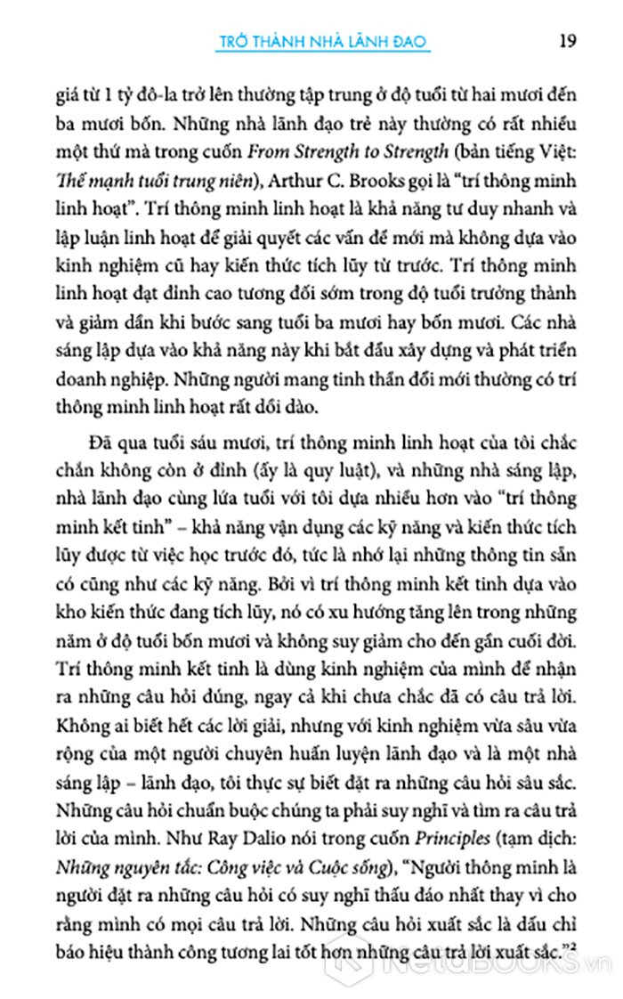 - Giải mã bước chuyển mình từ "Trí thông minh linh hoạt" sang "Trí thông minh kết tinh": Sách phân tích sâu sắc quá trình chuyển đổi tư duy của nhà lãnh đạo – từ việc dùng sự nhạy bén, tư duy nhanh để sinh tồn giai đoạn đầu sang việc vận dụng kinh nghiệm tích lũy để đặt ra những câu hỏi đúng nhằm định hướng tổ chức.
