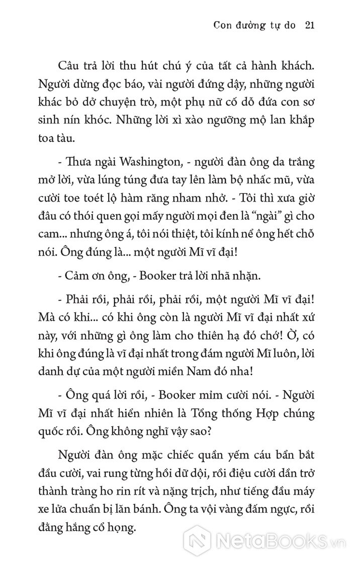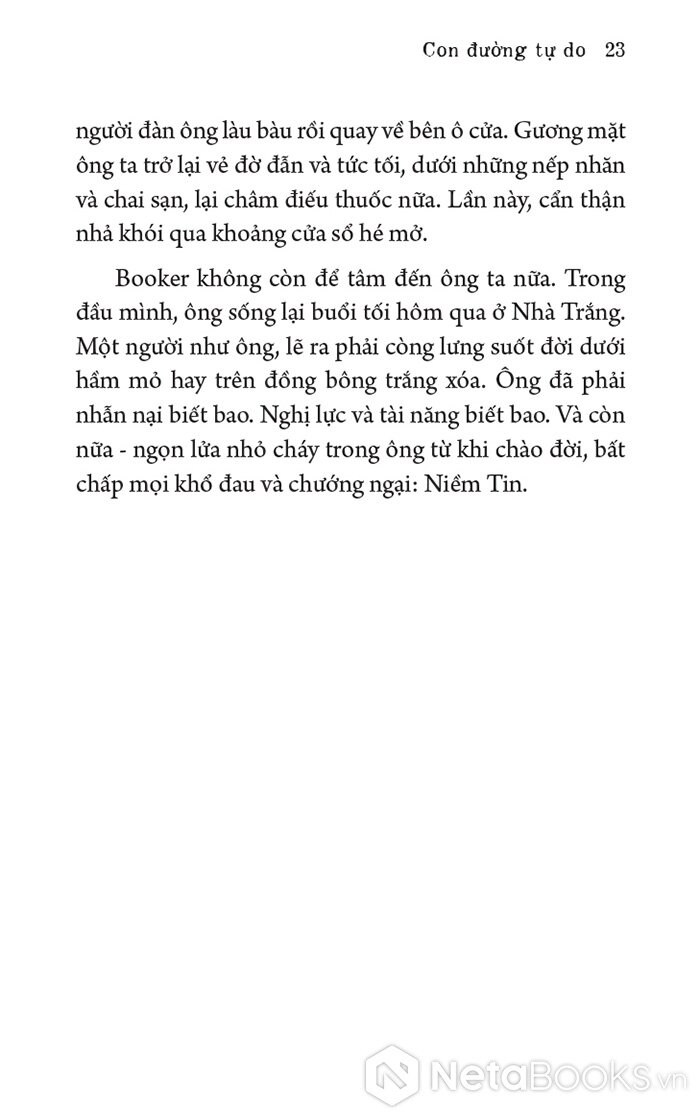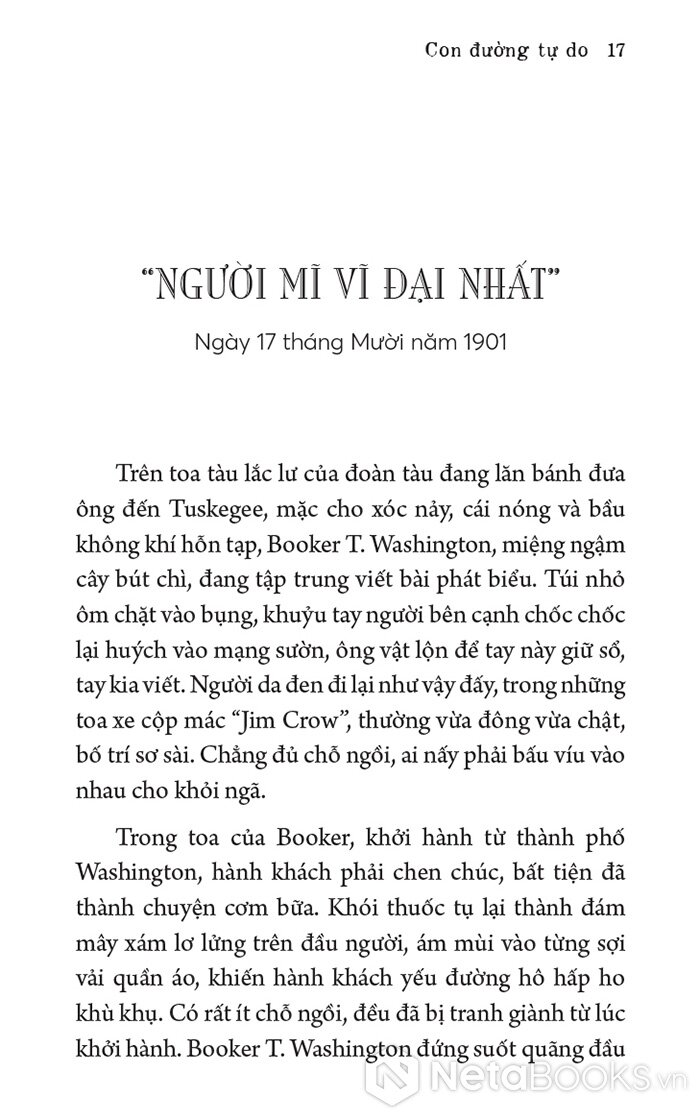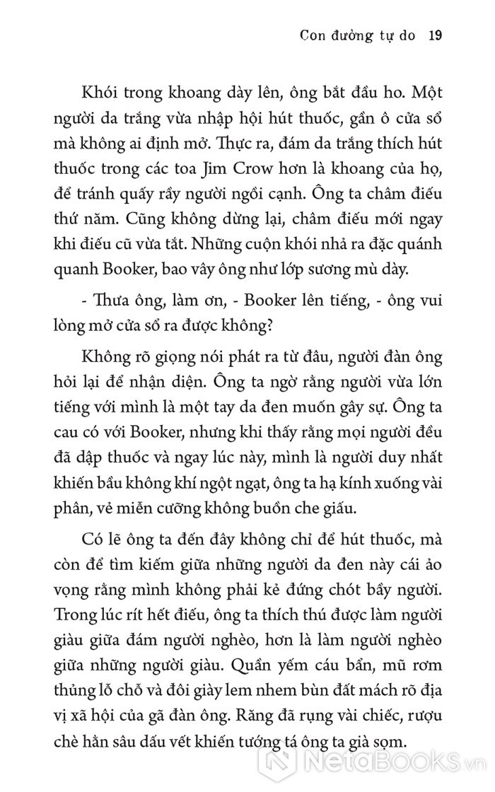 Booker, sinh ra là nô lệ, là tài sản của một gia đình chủ đồn điền ở bang Virginia. Năm 1865, khi Nội chiến Mĩ kết thúc, như hàng triệu nô lệ được giải phóng, Booker cùng gia đình lên đường tìm con đường tự do. Anh đã học tập và làm việc không ngừng nghỉ, để lớn lên và giúp đỡ những nô lệ tự giải phóng chính mình.