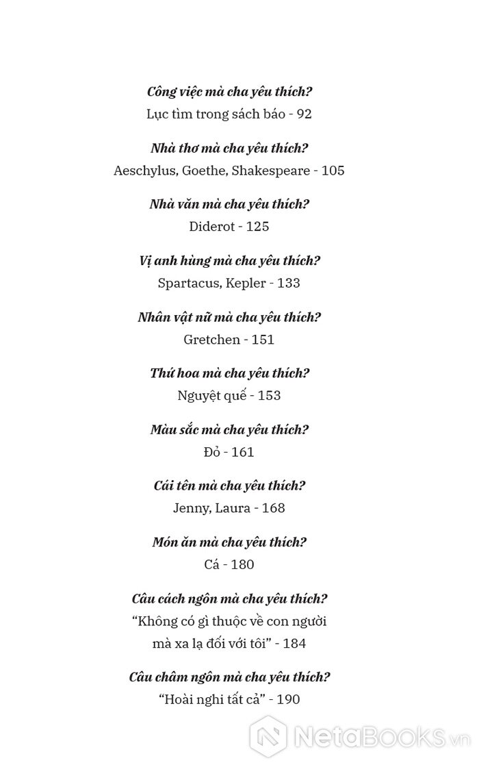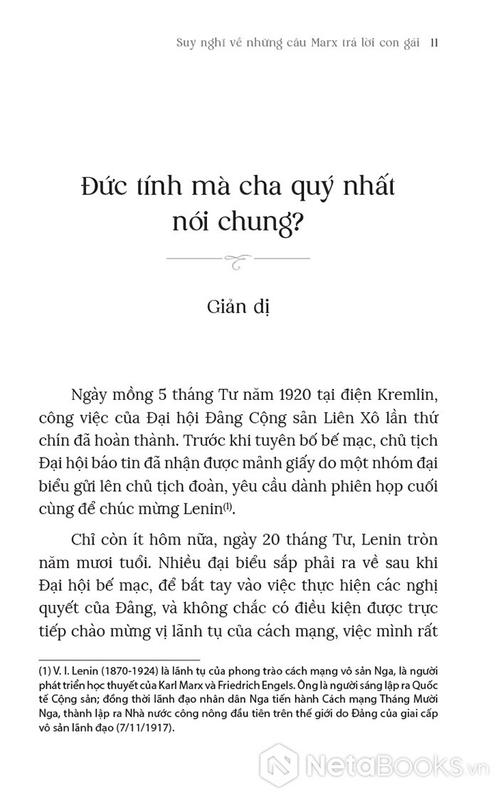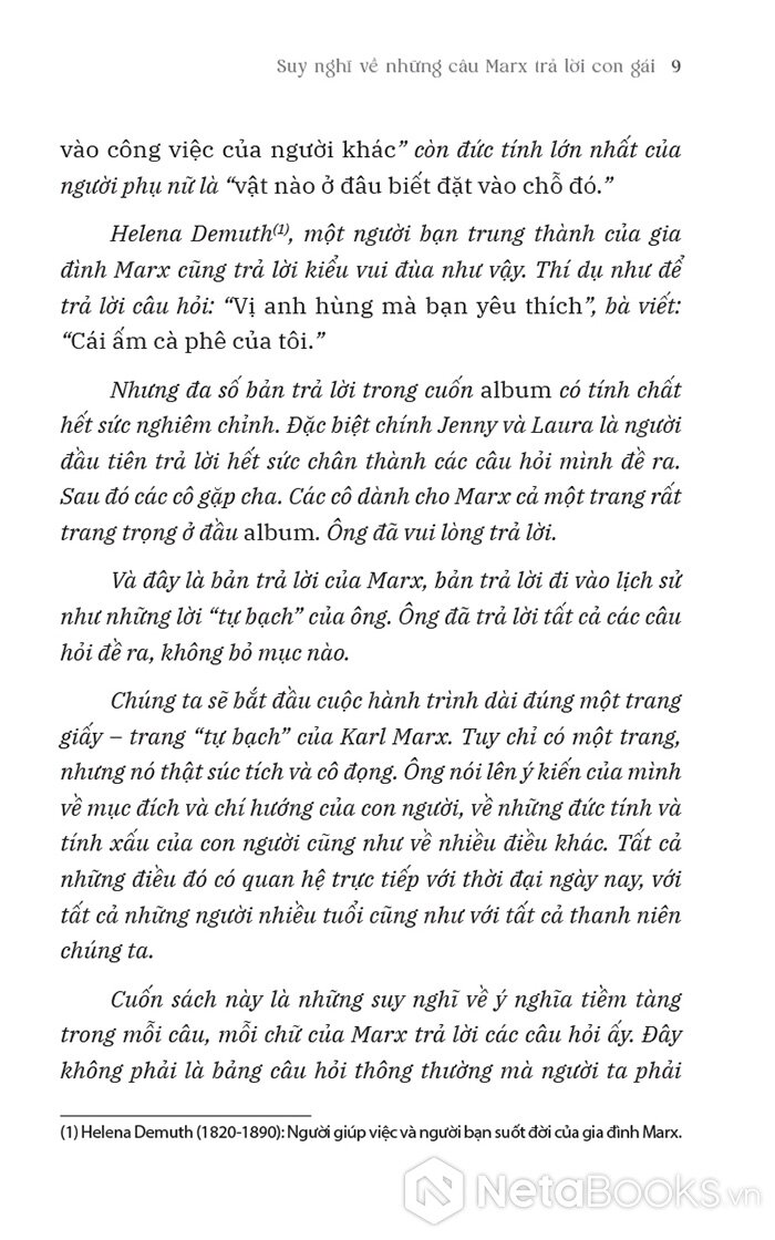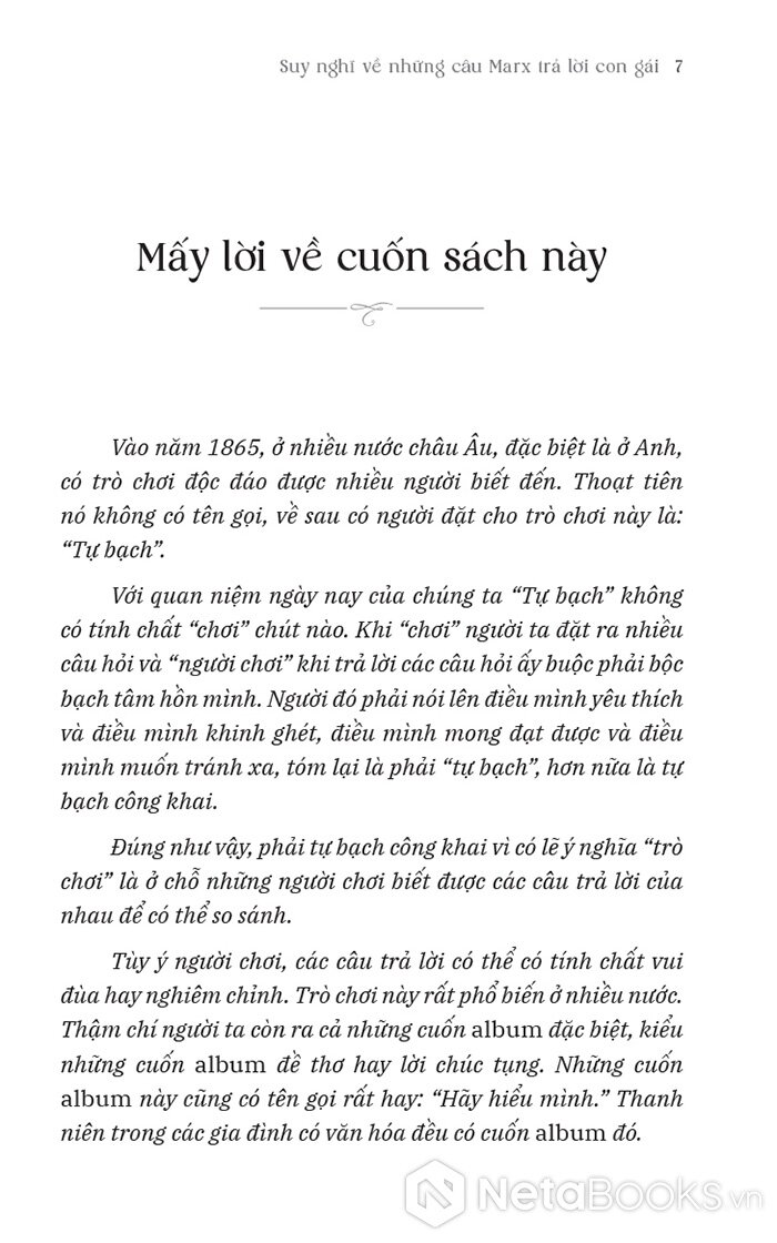 Dù chỉ là trò chơi gia đình vui vẻ, Marx trả lời hết những câu hỏi của các con gái. Những câu trả lời hé mở cho chúng ta một Marx không chỉ vĩ đại trong tư tưởng mà còn là người chồng, người cha ấm áp, chan chứa yêu thương, sống trọn vẹn giữa tình yêu gia đình và lí tưởng cách mạng.