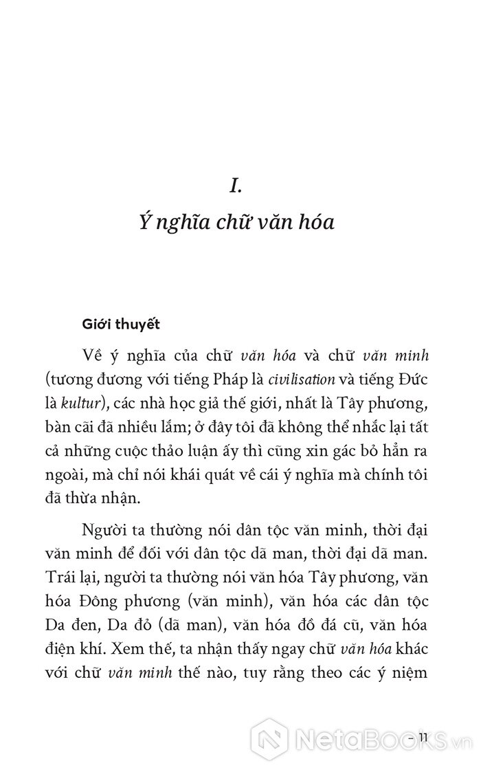 “Văn hóa là gồm tất cả những sáng tạo kiến thiết của loài người ở trong xã hội, tất cả những cái gì là không phải tự nhiên, là phi tự nhiên. Nhưng ở trong phạm vi cái phi tự nhiên ấy, ở trong lịch trình hoạt động của loài người từ buổi đầu đến nay, hay nói khác đi, ở trong lịch trình phát triển của văn hóa, mãi đến sáu bảy nghìn năm gần đây mới có đôi ba dân tộc vượt lên khỏi trình độ thấp thỏi mà đến trình độ văn minh, còn trong khoảng bao nhiêu vạn năm về trước toàn thể loài người vẫn ở những trình độ văn hóa thấp thỏi mà người ta gọi là mông muội hay dã man. Đến mãi ngày nay, một phần đông các dân tộc ở châu Phi, châu Úc, cả châu Á, cũng vẫn chưa thoát khỏi trạng thái dã man, chỉ có những người da trắng và người da vàng là đã đến trạng thái văn minh thôi. Vậy thời chúng ta có thể nói rằng ở trong phạm vi vũ trụ, văn hóa với tự nhiên là hai cái đối đãi nhau, mà ở trong phạm vi văn hóa thì văn minh với dã man (hay mông muội) là hai cái đối đãi nhau.”