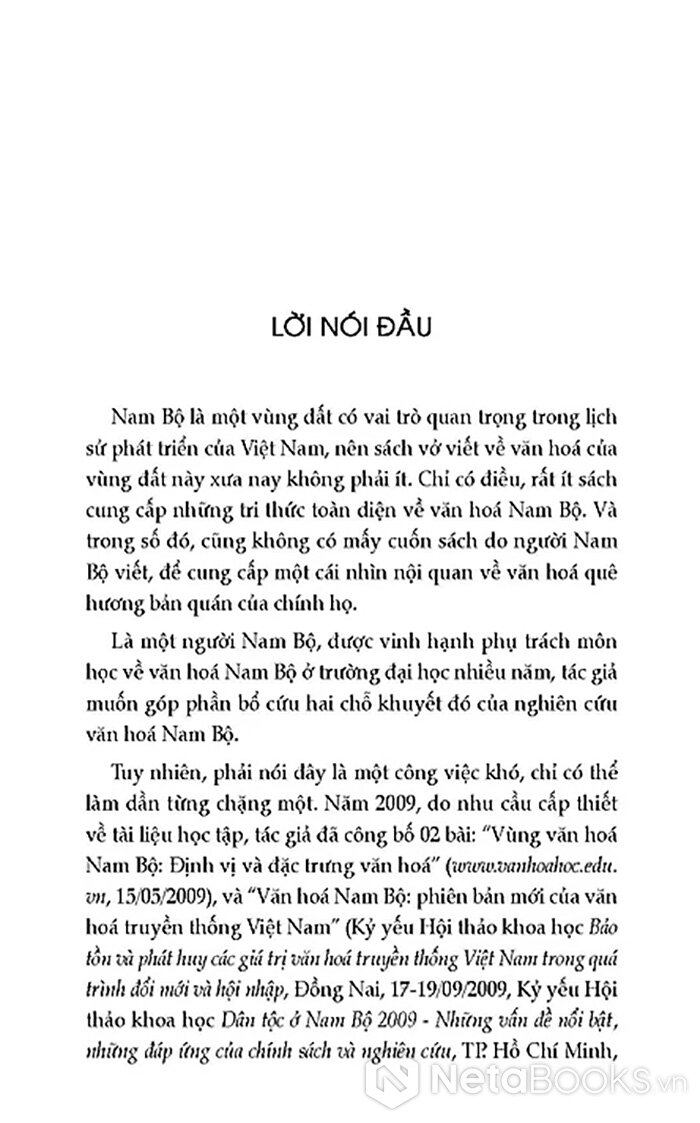 Là một người Nam Bộ, được vinh hạnh phụ trách môn học về văn hoá Nam Bộ ở trường đại học nhiều năm, tác giả muốn góp phần bổ cứu hai chỗ khuyết đó của nghiên cứu văn hoá Nam Bộ.