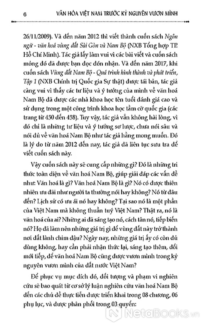 Để phục vụ mục đích đó, đối tượng và phạm vi nghiên cứu sẽ bao quát từ cơ sở lý luận nghiên cứu văn hoá Nam Bộ đến các chủ đề thực tiễn được triển khai trong 08 chương, 06 phụ lục, và được phân phối trong 03 quyển: