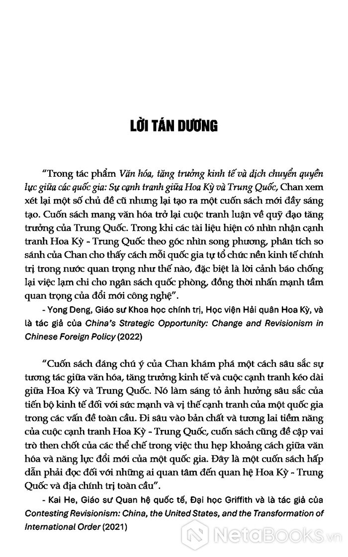 “Cuốn sách đáng chú ý của Chan khám phá một cách sâu sắc sự tương tác giữa văn hóa, tăng trưởng kinh tế và cuộc cạnh tranh kéo dài giữa Hoa Kỳ và Trung Quốc. Nó làm sáng tỏ ảnh hưởng sâu sắc của tiến bộ kinh tế đối với sức mạnh và vị thế cạnh tranh của một quốc gia trong các vấn đề toàn cầu. Đi sâu vào bản chất và tương lai tiềm năng của cuộc cạnh tranh Hoa Kỳ - Trung Quốc, cuốn sách cũng đề cập vai trò then chốt của các thể chế trong việc thu hẹp khoảng cách giữa văn hóa và năng lực đổi mới của một quốc gia. Đây là một cuốn sách hấp dẫn phải đọc đối với những ai quan tâm đến quan hệ Hoa Kỳ - Trung Quốc và địa chính trị toàn cầu” - Kai He, Giáo sư Quan hệ quốc tế, Đại học Griffith và là tác giả của Contesting Revisionism: China, the United States, and the Transformation of International Order (2021)