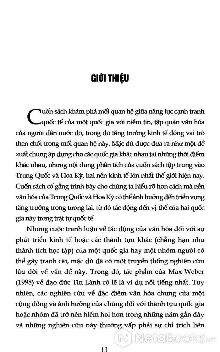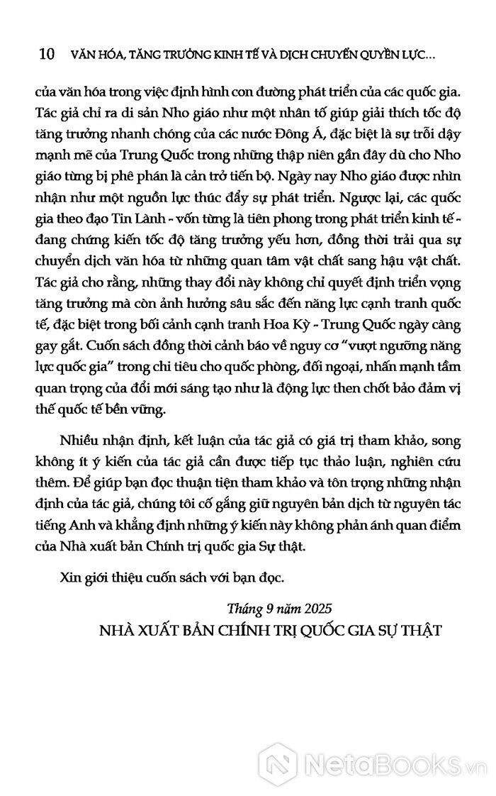 Bằng cách kết nối kinh tế, văn hóa và quyền lực trong một khung phân tích thống nhất, cuốn sách mang đến một góc nhìn tỉnh táo về trật tự thế giới đang hình thành. Không chỉ giúp người đọc hiểu rõ hơn cuộc cạnh tranh giữa các cường quốc, tác phẩm còn gợi mở một câu hỏi rộng hơn: muốn trở thành một quốc gia mạnh, cần nuôi dưỡng những giá trị và cấu trúc xã hội như thế nào?