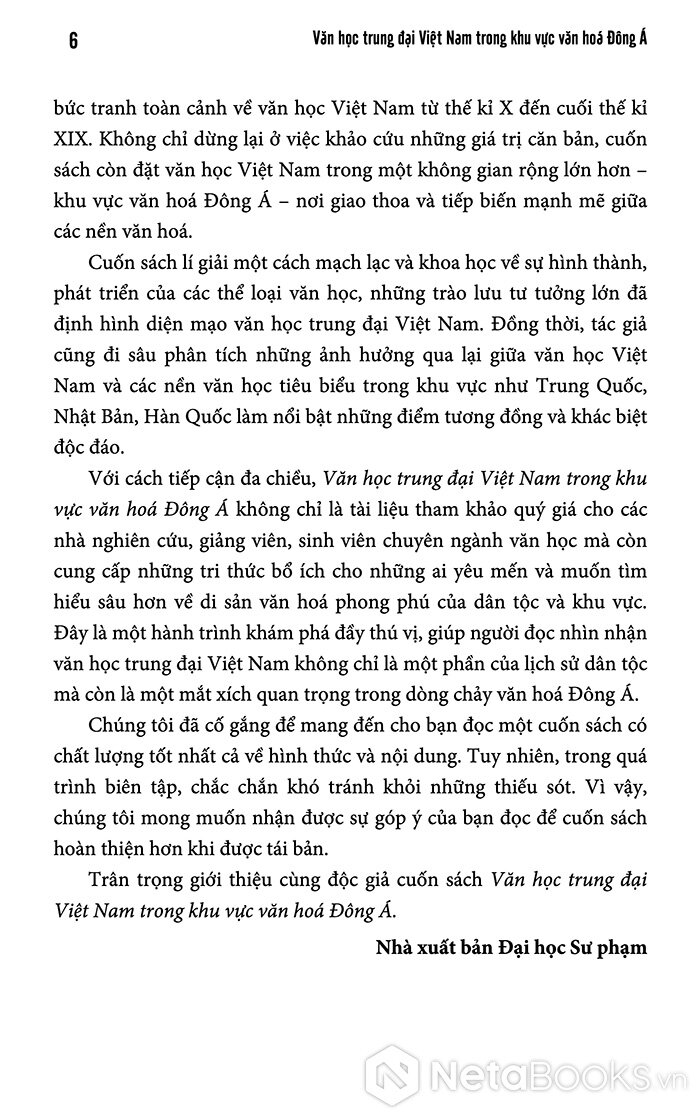 Với các tiếp cận đa chiều, Văn học trung đại Việt Nam trong khu vực văn hoá Đông Á không chỉ là tài liệu tham khảo quý giá cho các nhà nghiên cứu, giảng viên, sinh viên chuyên ngành văn học mà còn là nguồn tri thức bổ ích cho những ai yêu mến và muốn tìm hiểu sâu hơn về di sản văn hoá phong phú của dân tộc và khu vực. Đây là một hành trình khám phá đầy thú vị, giúp người đọc nhìn nhận văn học trung đại Việt Nam không chỉ là một phần của lịch sử dân tộc mà còn là một mắt xích quan trọng trong dòng chảy văn hoá Đông Á.