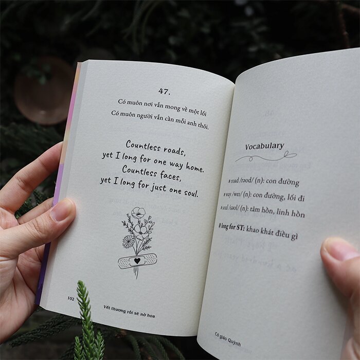 Có những ngày trái tim ta như một khu vườn sau cơn bão, tan tác và đầy rẫy những vết xước. Vào những lúc như thế, ta không cần những lời khuyên lớn lao, mà chỉ cần một bàn tay dịu dàng chạm vào vết thương, thầm thì rằng: "Mọi chuyện rồi sẽ ổn thôi". Cuốn sách song ngữ "Vết thương rồi sẽ nở hoa" của Cô Giáo Quỳnh chính là bàn tay vỗ về ấy, một liều thuốc cho tâm hồn được dệt nên từ những sợi tơ ngôn ngữ mong manh nhưng đầy sức sống.