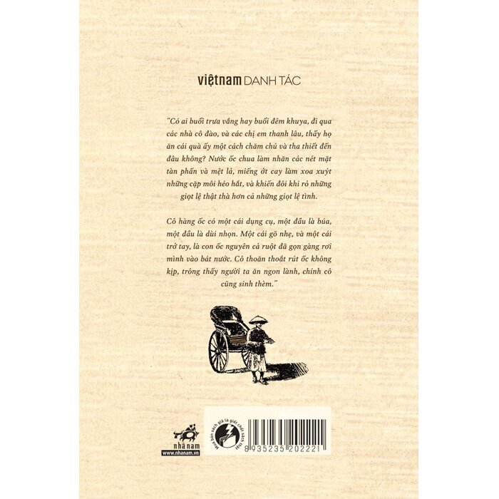 “Có ai buổi trưa vắng hay buổi đêm khuya, đi qua các nhà cô đào, và các chị em thanh lâu, thấy họ ăn cái quà ấy một cách chăm chú và tha thiết đến đâu không? Nước ốc chua làm nhăn các nét mặt tàn phấn và mệt lả, miếng ớt cay làm xoa xuýt những cặp môi héo hắt, và khiến đôi khi rỏ những giọt lệ thật thà hơn cả những giọt lệ tình. Cô hàng ốc có một cái dụng cụ, một đầu là búa, một đầu là dùi nhọn. Một cái gõ nhẹ, và một cái trở tay, là con ốc nguyên cả ruột đã gọn gàng rơi mình vào bát nước. Cô thoăn thoắt rút ốc không kịp, trông thấy người ta ăn ngon lành, chính cô cũng sinh thèm.”