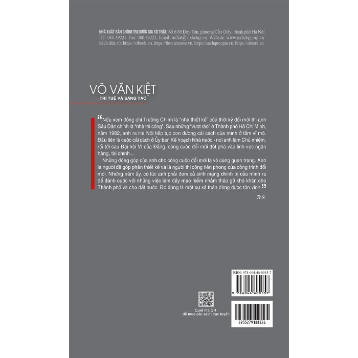 “Võ Văn Kiệt - Trí tuệ và sáng tạo” là cuốn sách khắc họa sinh động chân dung một nhà lãnh đạo kiệt xuất của cách mạng Việt Nam trong thế kỷ XX - người suốt cuộc đời gắn bó mật thiết với nhân dân, dám nghĩ, dám làm và không ngừng tìm tòi con đường đổi mới từ thực tiễn.