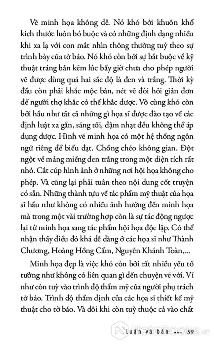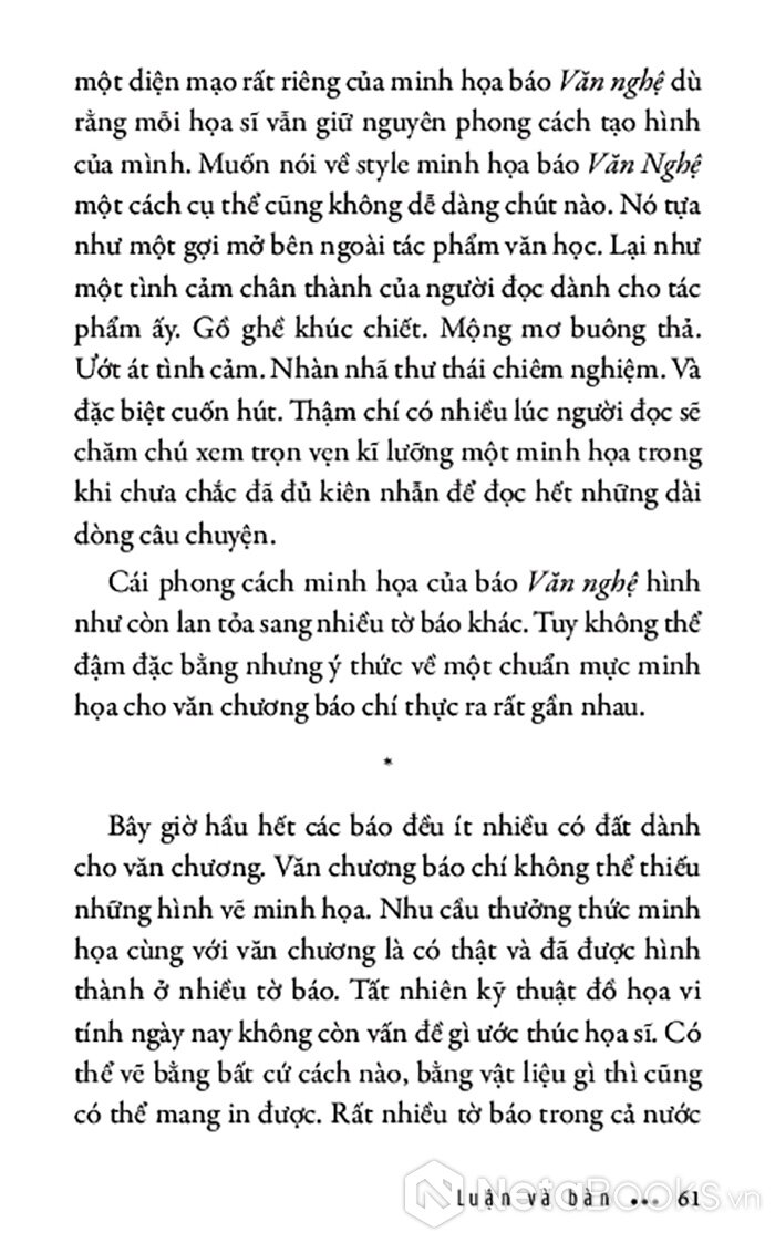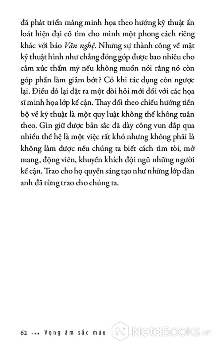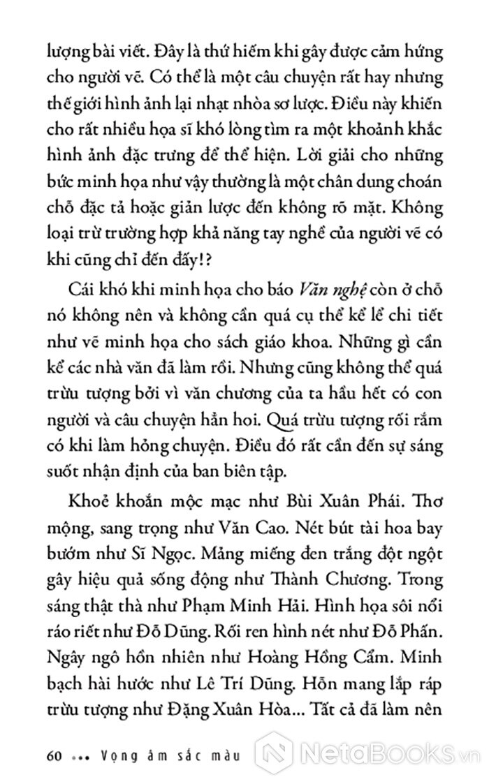 Vọng âm của những lớp tranh, lớp người, lớp cảm xúc ấy kiến tạo một không gian suy niệm sinh động, tự do, vừa khúc chiết vừa có độ vỡ vụn thời gian. Một cuốn sách dành cho những ai từng lắng nghe vọng âm từ những bức tranh.