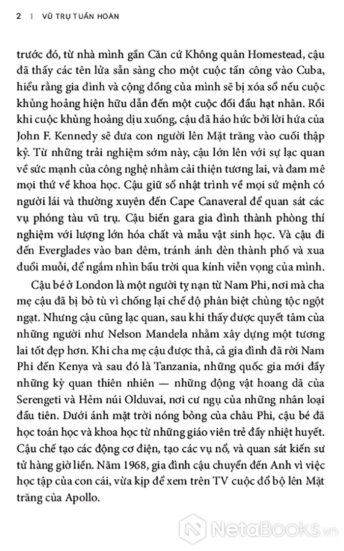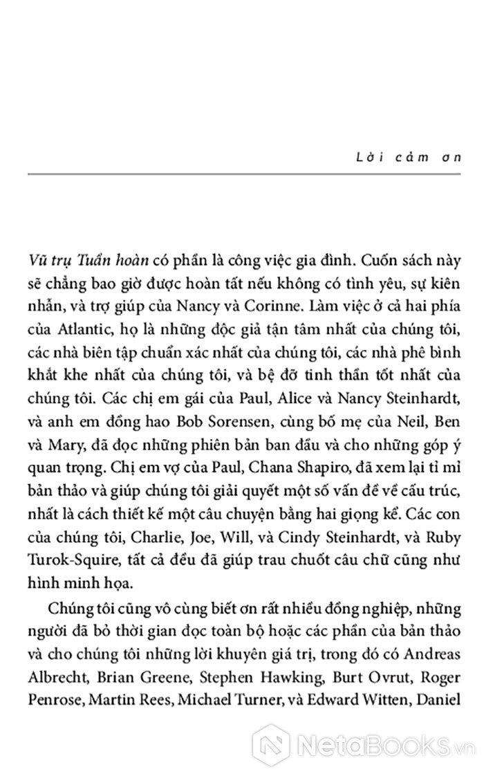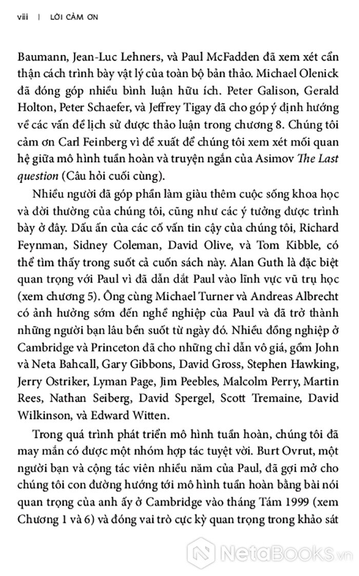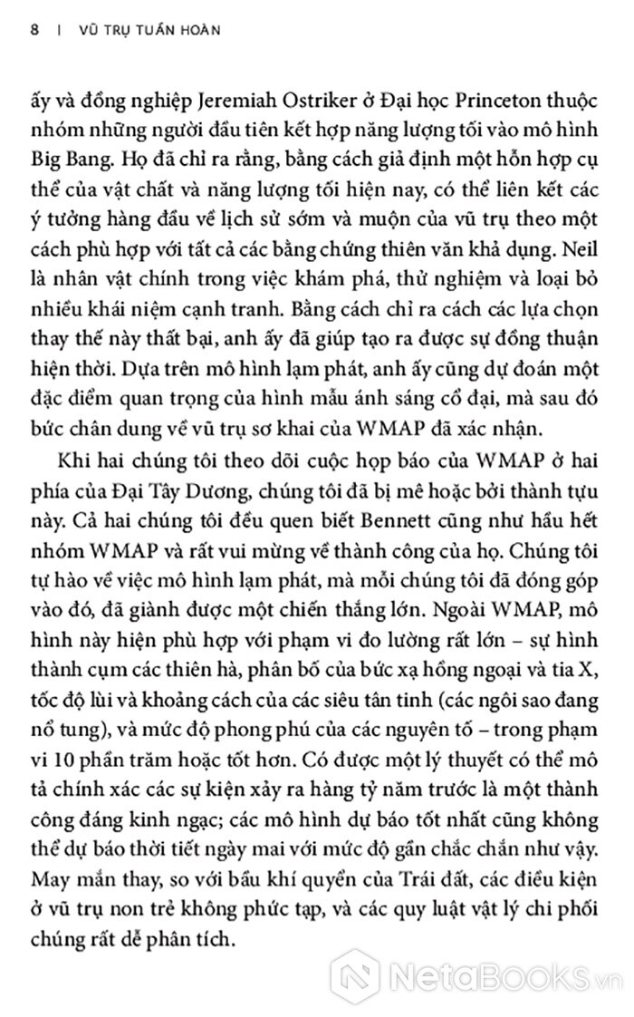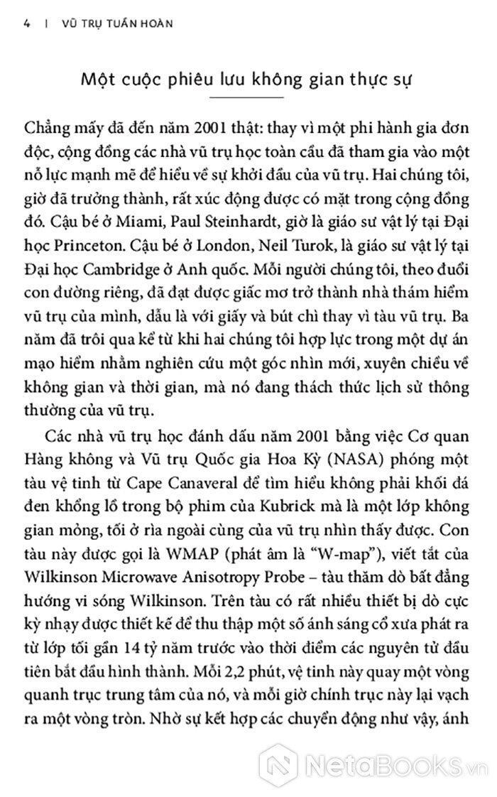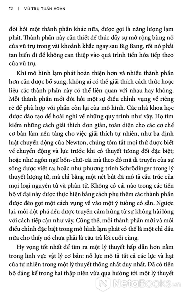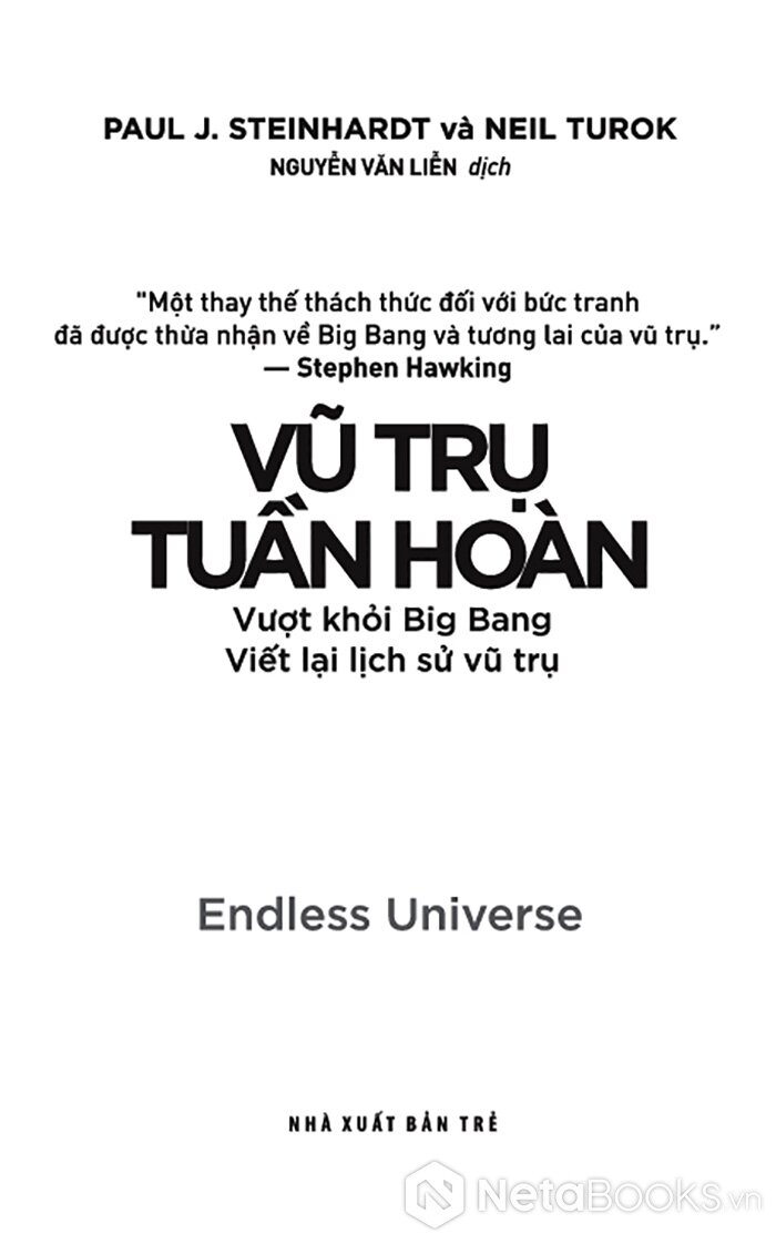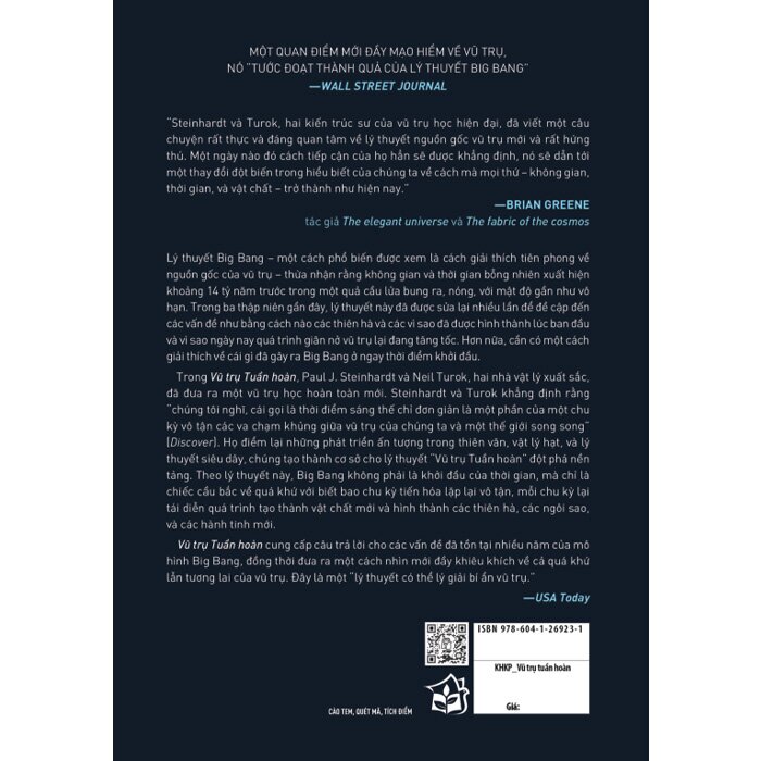 Trong VŨ TRỤ TUẦN HOÀN, Paul J. Steinhardt và Neil Turok, hai nhà vật lý xuất sắc, đã đưa ra một vũ trụ học hoàn toàn mới. Hai tác giả cho rằng "cái gọi là thời điểm sáng thế chỉ là một phần của một chu kỳ vô tận các va chạm khủng giữa vũ trụ của chúng ta và một thế giới song song" [Discover].