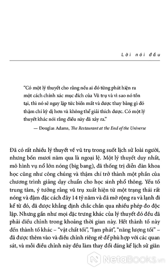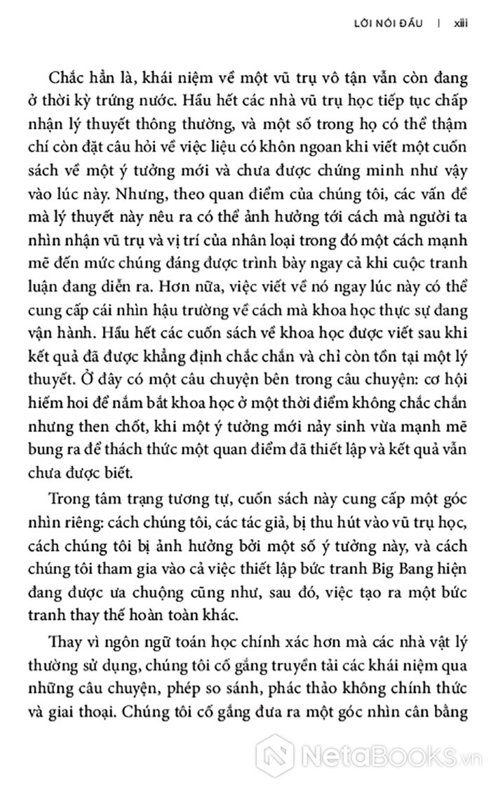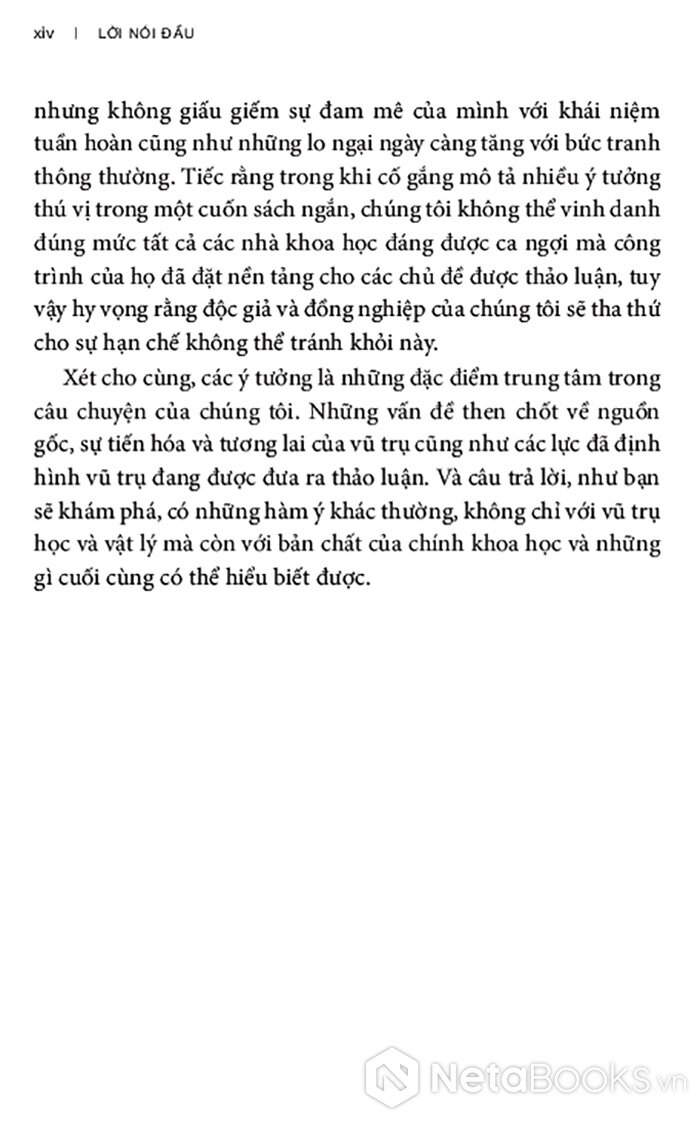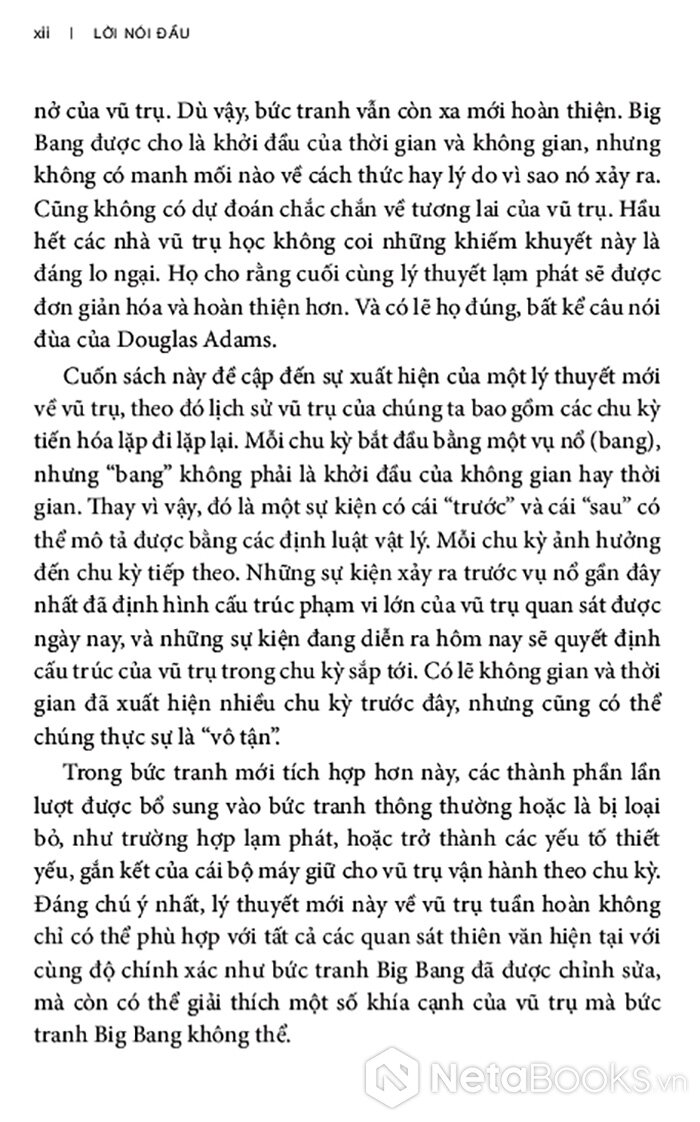 Họ điểm lại những bước tiến trong thiên văn, vật lý hạt và lý thuyết siêu dây, chúng tạo thành cơ sở cho lý thuyết "Vũ trụ tuần hoàn" đột phá nền tảng. Theo lý thuyết này, Big Bang không phải là khởi đầu của thời gian, mà chỉ là chiếc cầu bắc về quá khứ với biết bao chu kỳ tiến hóa lặp lại vô tận, mỗi chu kỳ lại tái diễn quá trình tạo thành vật chất mới và hình thành các thiên hà, các ngôi sao và các hành tinh mới.