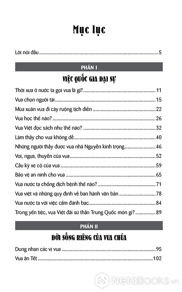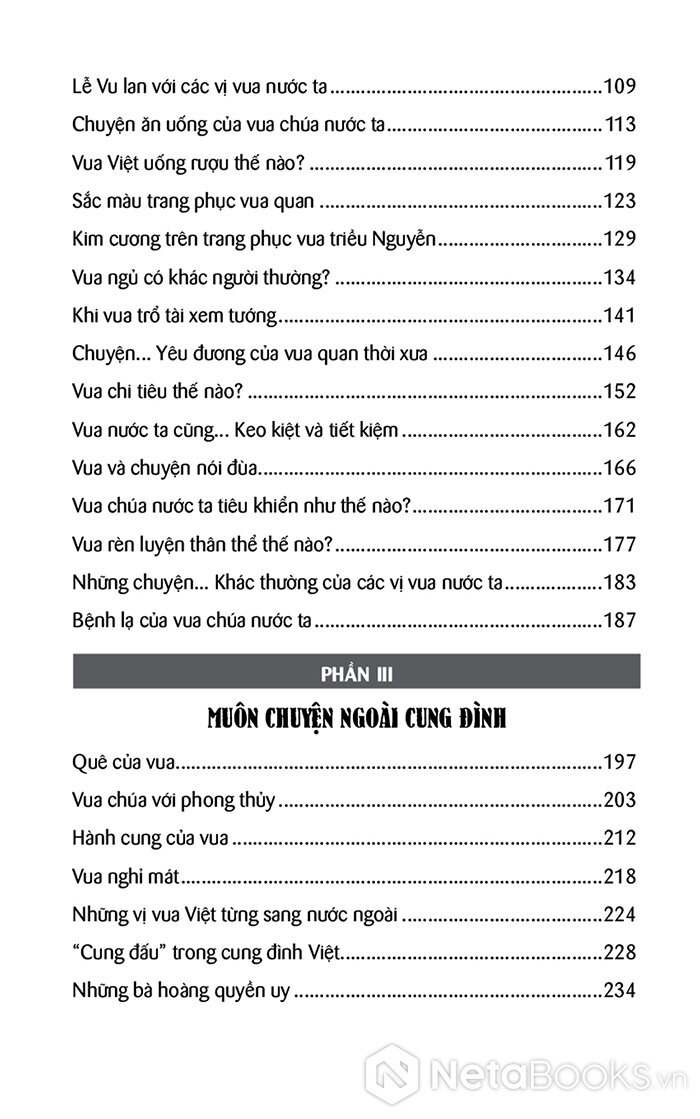 Cuốn sách là tập hợp những câu chuyện như vậy để hầu chuyện bạn đọc, từ những câu chuyện “quốc gia đại sự” như “Thời xưa nước ta gọi vua là gì?”, “Quy định trang phục, lễ nhạc khi vua thiết triều ra sao?", đến những câu chuyện độc đảo khi vua chúa xử lý công việc triều chính, các trường hợp nhà vua “bổ nhiệm thần tốc” bề tôi vì nhận thấy tài năng vượt trội, quan điểm của các vị vua về phong thủy, hay vua chúa nước ta xây hành cung thế nào, còn có cả việc bảo vệ an toàn của vua...