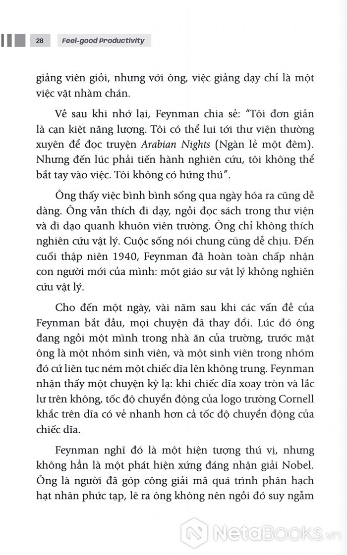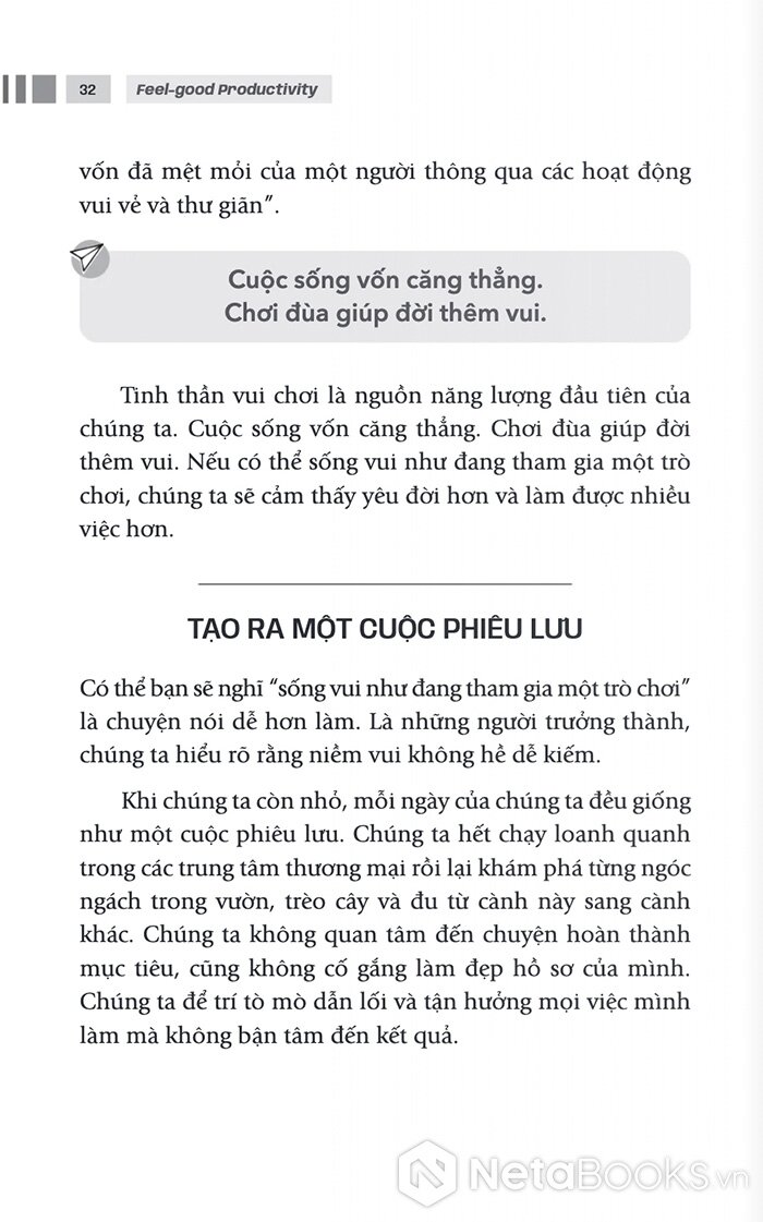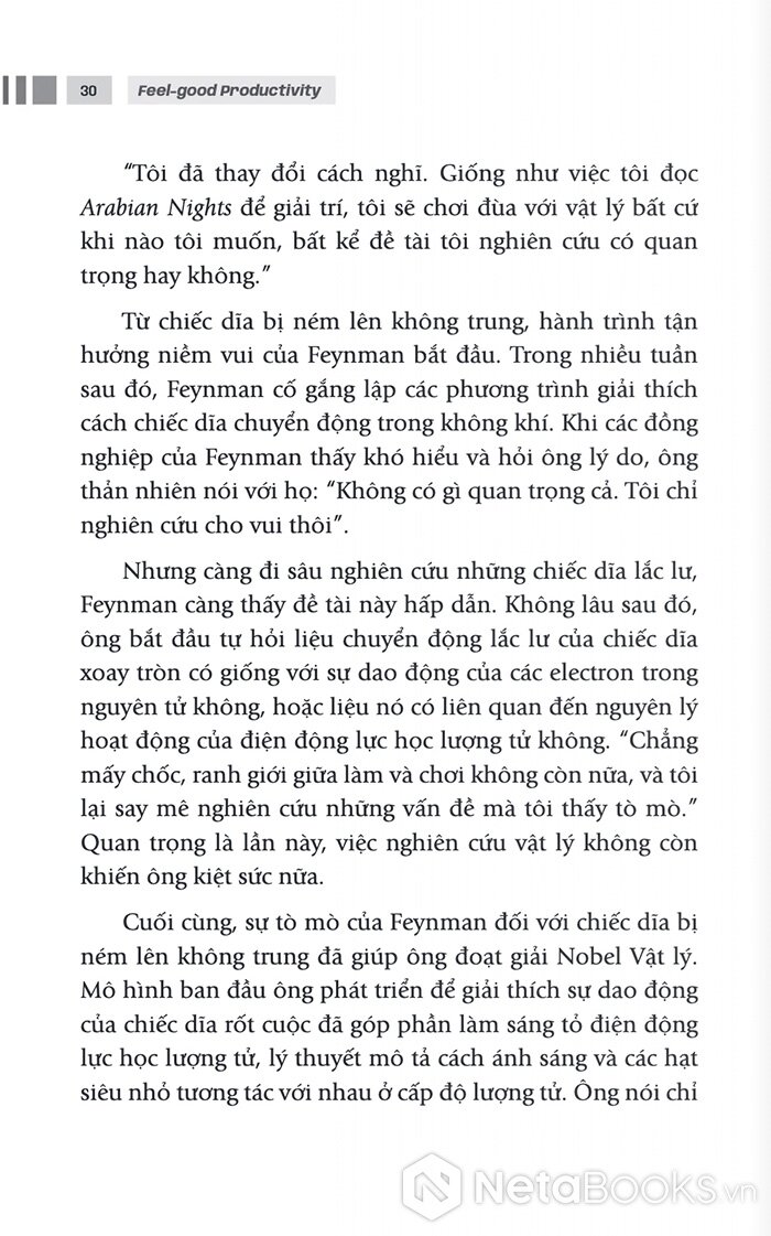 Một trong những ý tưởng thú vị mà tác giả đưa ra là “tinh thần vui chơi”. Theo Ali Abdaal, rất nhiều nhà khoa học, nghệ sĩ và người thành công trong lịch sử đạt được những thành tựu lớn lao không phải vì họ ép buộc bản thân làm việc, mà vì họ thật sự tò mò và thích thú với những gì mình đang làm. Khi công việc trở thành một trò chơi trí tuệ hoặc một cuộc phiêu lưu sáng tạo, năng lượng làm việc sẽ xuất hiện một cách tự nhiên.