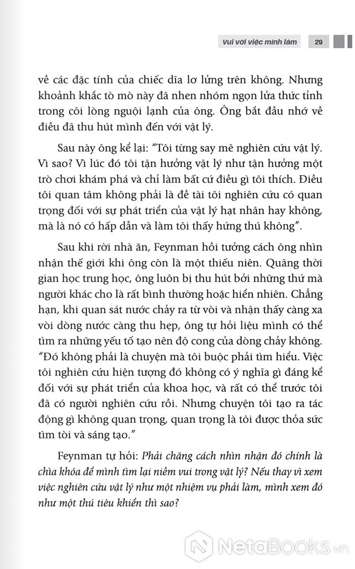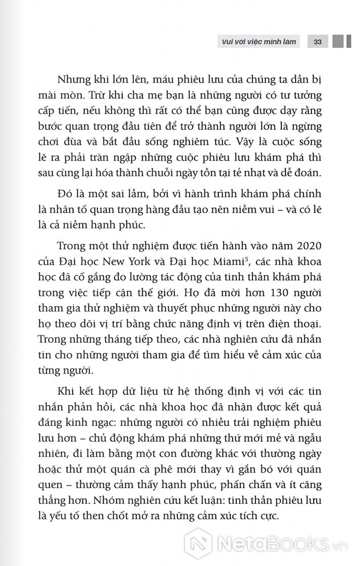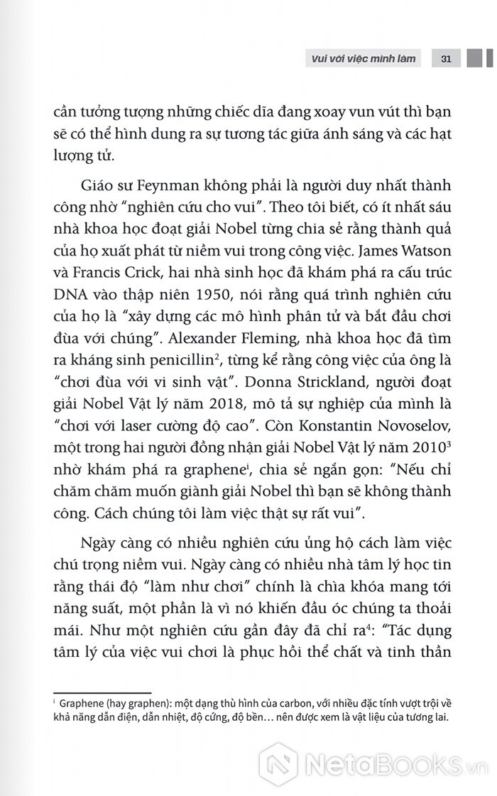 Ali Abdaal không phải là một thiền sư, nhưng những kiến giải mang tính khoa học của anh lại không hề xa lạ với minh triết phương Đông. Đọc “Vui với việc mình làm”, có thể bạn sẽ thấy ngược đời khi ứng dụng “phương pháp shoshin” vào công việc. Shoshin nghĩa là “sơ tâm” hay “tâm trí của người mới bắt đầu”, nhờ vậy nó tạo điều kiện cho chúng ta nhìn nhận mọi thứ theo một hướng mới. Bạn cũng sẽ bắt gặp tiếng chuông tỉnh thức của thiền sư Thích Nhất Hạnh và nhìn nhận “tiếng chuông” ấy theo một cách thức mới mẻ hơn, mang tính cá nhân hơn. Rồi lý thuyết dòng chảy của Mihaly Csikszentmihalyi, hẳn không còn xa lạ với nhiều người, giờ lại trở nên thiết thực và rõ ràng thêm.