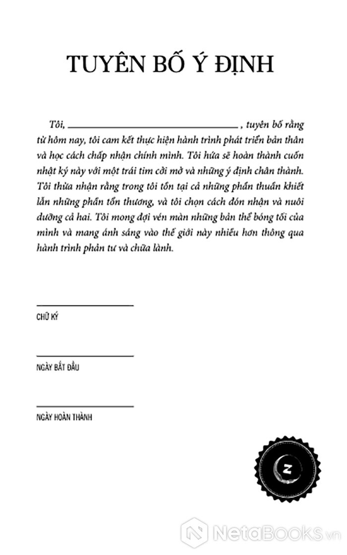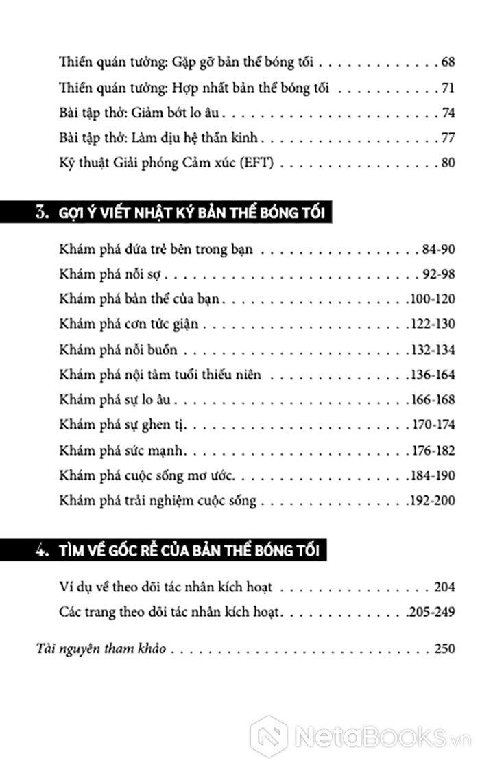 Điểm làm nên sức cuốn hút đặc biệt của Vượt Qua Bóng Tối nằm ở hệ thống bài tập trị liệu được thiết kế xuyên suốt, giúp người đọc không chỉ hiểu mà còn thật sự trải nghiệm quá trình làm việc với bản thể bóng tối. Từ loạt bài “Điền vào chỗ trống” chạm đến tầng vô thức, thực hành “Nhìn vào gương” để đối diện phần bị che giấu, kỹ thuật EFT giải phóng cảm xúc, các bài thở và thiền quán tưởng cho đến những chủ đề sâu hơn như “Vẽ bản đồ vết thương”, “Khám phá đứa trẻ bên trong”, “Khám phá nỗi sợ”, hay các trang “Theo dõi tác nhân kích hoạt” - mỗi bài tập đều gắn kết chặt chẽ với tiến trình chuyển hóa nội tâm. Chúng hoạt động như những nhịp thở sâu, giúp người đọc từng bước tháo gỡ cảm xúc, quan sát chính mình và chữa lành từ bên trong.
